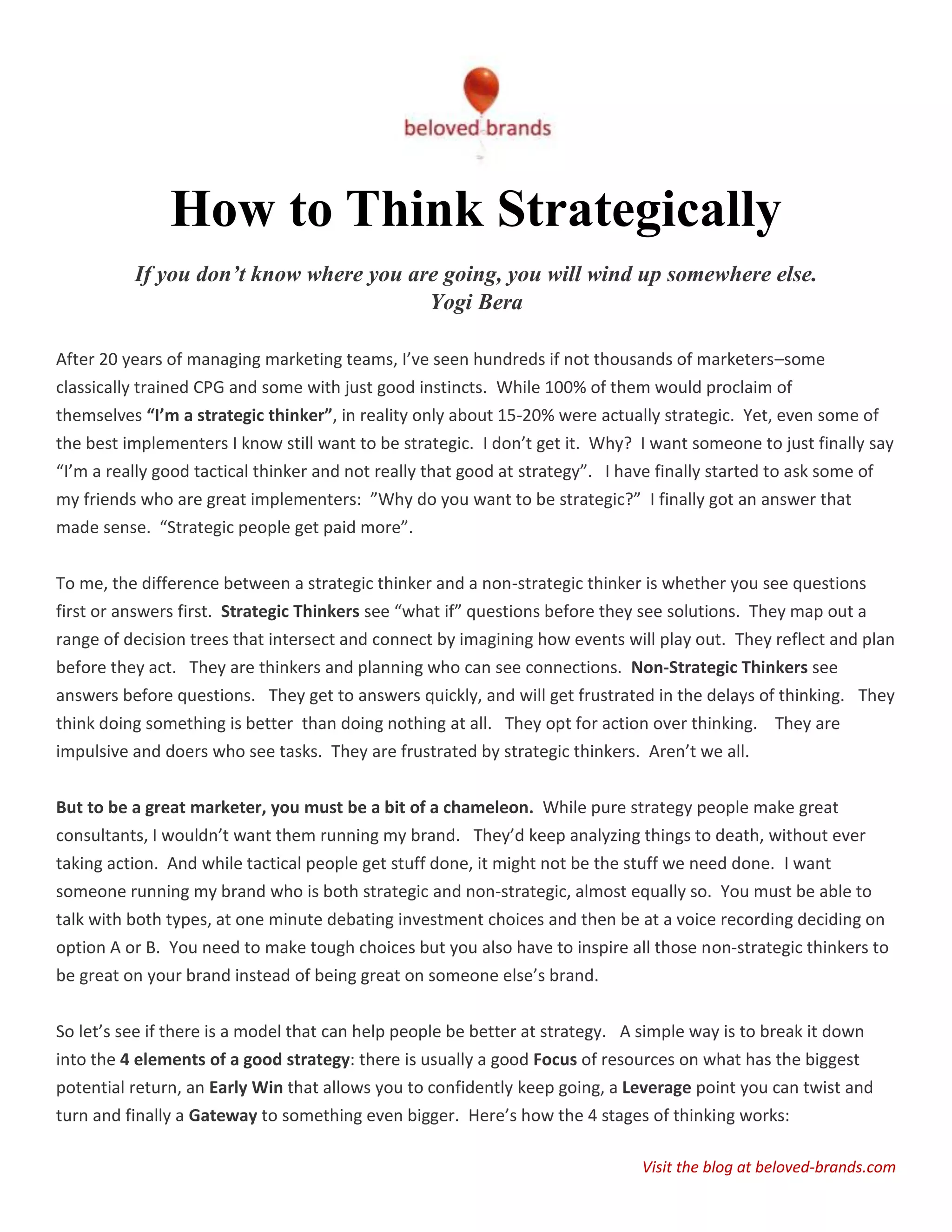Graham Robertson, President of Beloved Brands Inc., discusses the importance of strategic thinking for marketers. He defines strategic thinkers as those who see "what if" questions before solutions, while non-strategic thinkers see answers before questions. Robertson argues that to be a great marketer, one must be both strategic and tactical. He provides a four stage model for strategic thinking: focus, early win, leverage, and gateway. Applying this model to historical examples like D-Day and marketing examples like Avril Lavigne's 2005 album launch, Robertson argues that focusing energy in the right areas can lead to bigger successes.