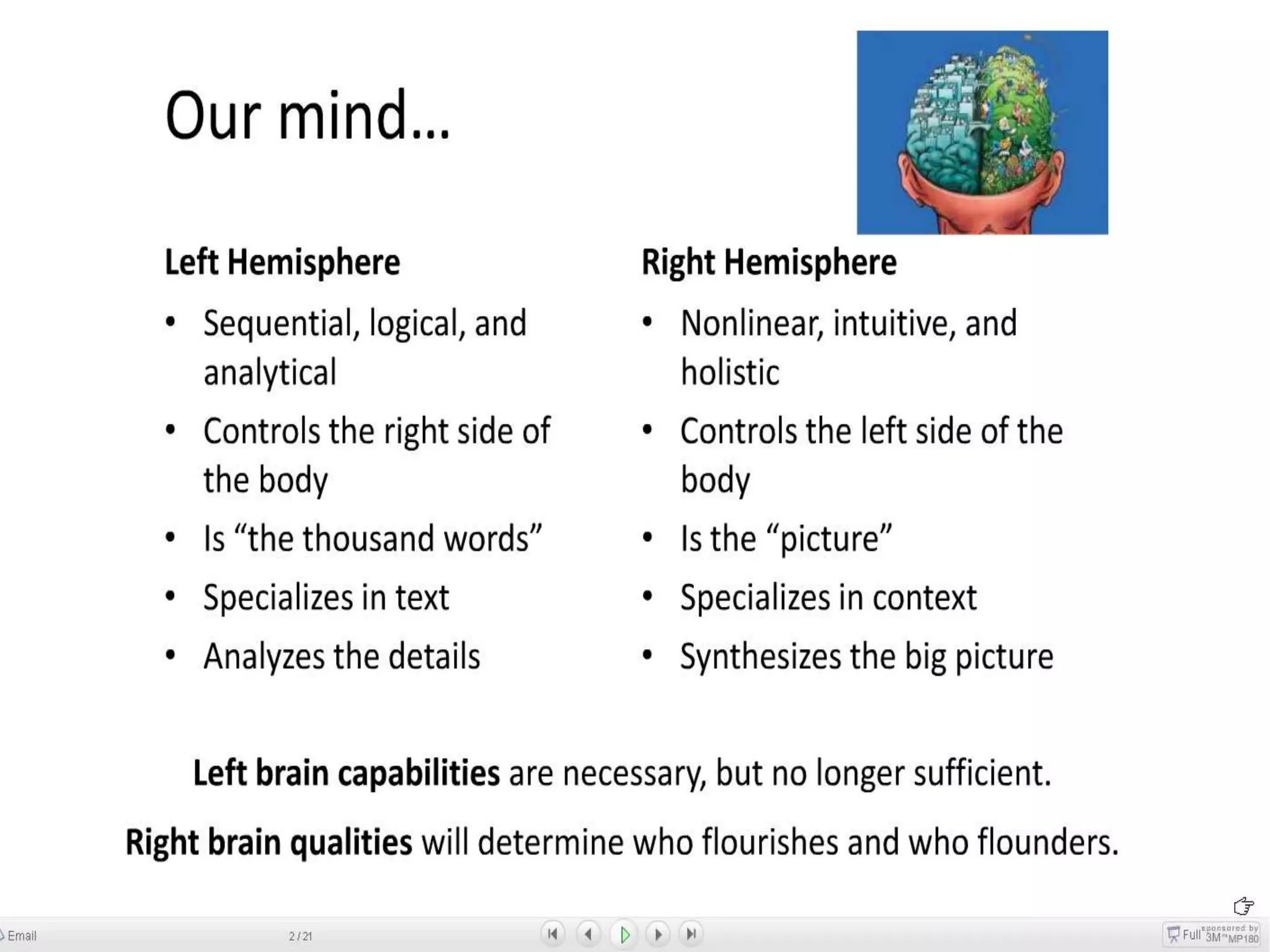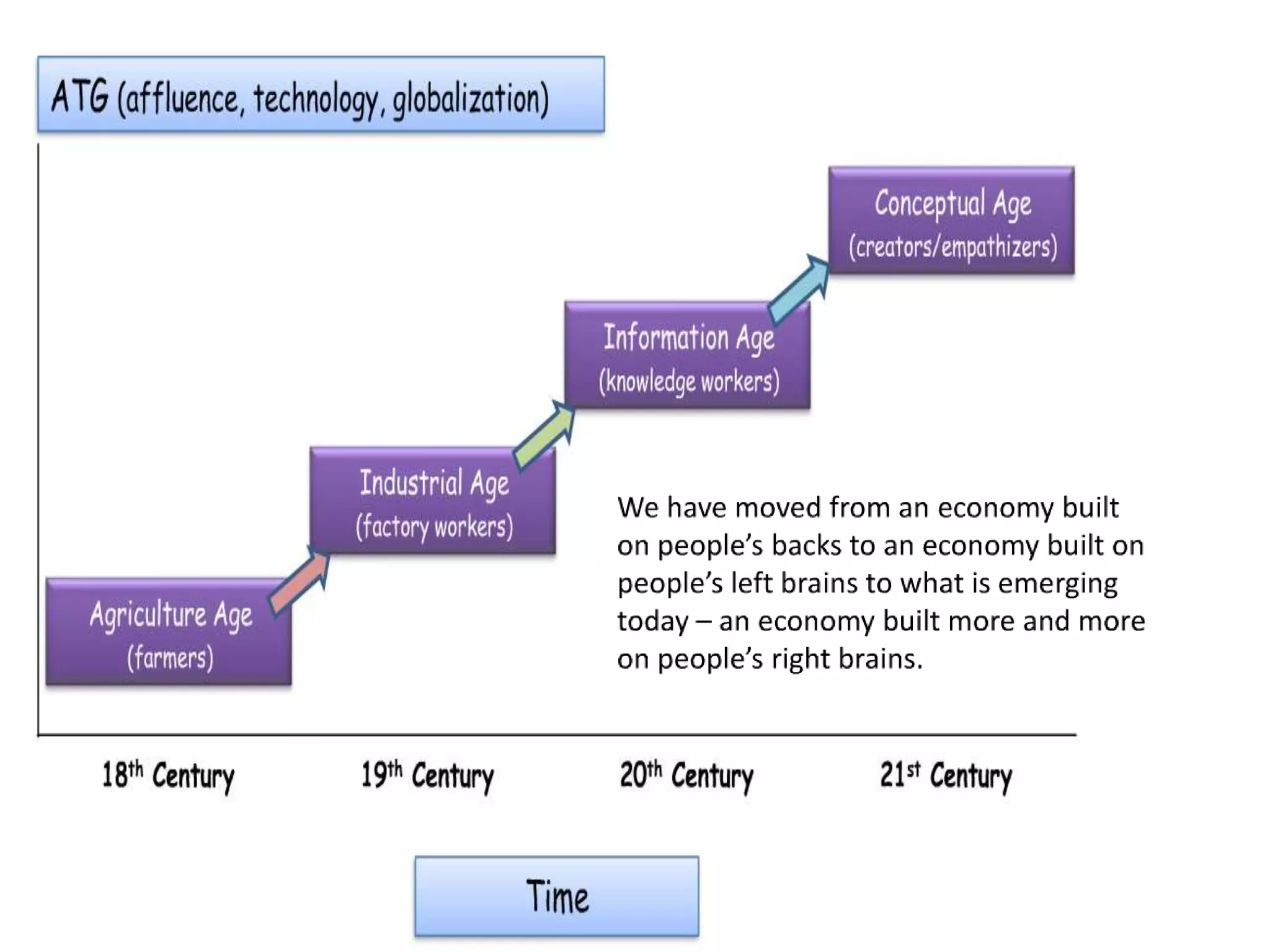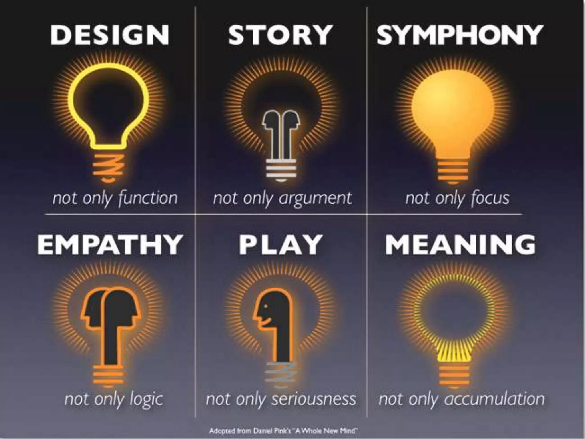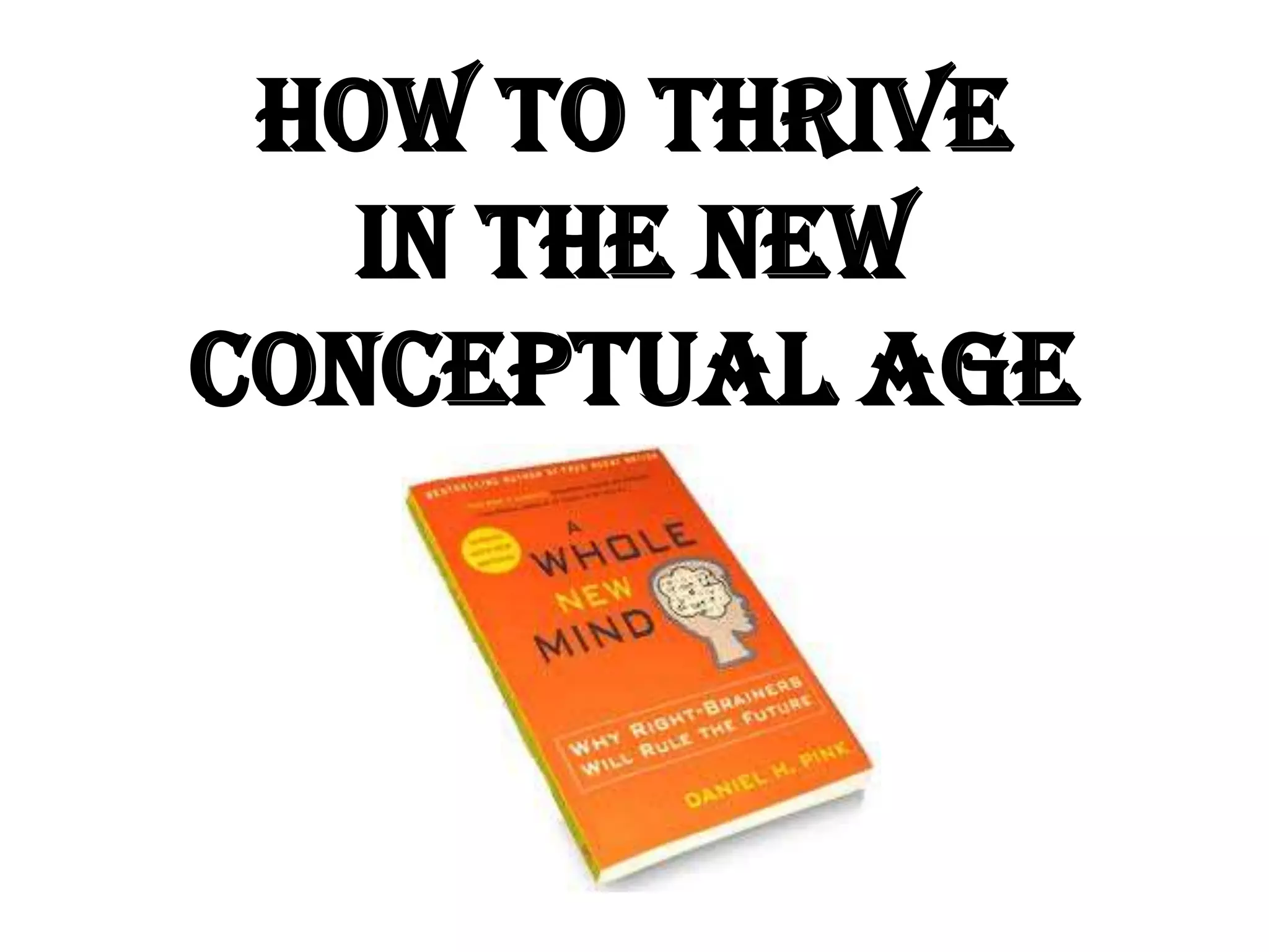 The document discusses how to thrive in the new "Conceptual Age" by developing six essential skills: high concept, high touch, design, story, empathy, and play. It explains that the Conceptual Age is characterized by the diminished importance of left brain/sequential thinking and the rising importance of right brain/contextual thinking, brought about by trends like abundance, Asian economic influence, and automation. Readers are encouraged to strengthen skills like these that will help them navigate the emerging landscape through exercises and further resources provided at the end of each chapter.