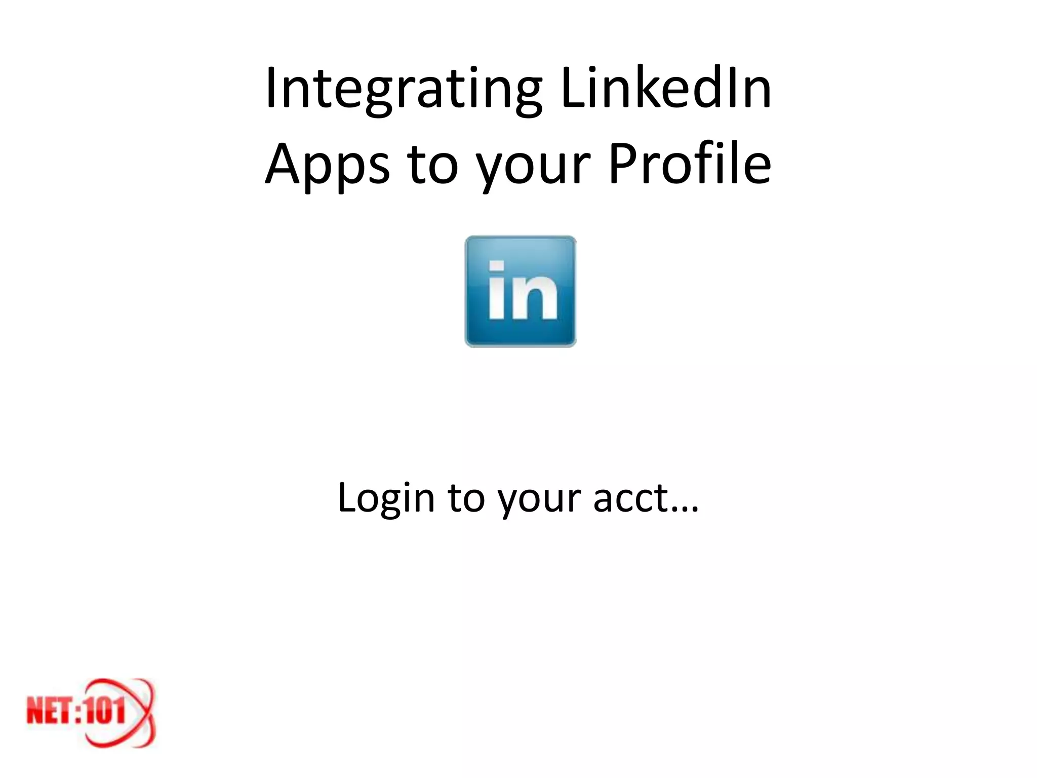 This document provides instructions for integrating LinkedIn applications to a user's profile. It outlines 3 steps - logging into your LinkedIn account, selecting "More" and then "Get More Applications", and then selecting a specific app and clicking "Add Application" to integrate it.