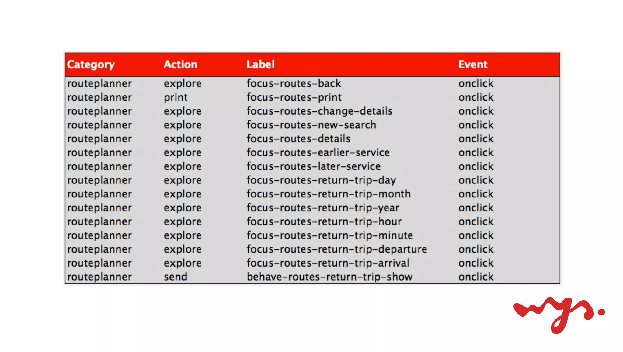 This document discusses implementing event tracking on a public transportation company's route planning tool to better understand how users interact with it. It proposes an Event Tracking Implementation Schema (E.T.I.S.) to uniformly track and categorize events. Case studies found users frequently searched by "intersection" and "identification", so the tool's autocomplete can be improved. While many viewed route details and schedules, few planned return trips, so those features need better prominence. The conclusion is E.T.I.S. will analyze the tool's usability, engagement models will shape user actions, and search options and planning features will be restructured based on usage data and intelligence.