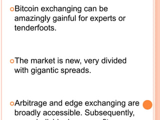 The document discusses the advantages of trading Bitcoin, emphasizing its profitability for both experts and beginners due to factors like market volatility, global reach, and continuous trading. It highlights the opportunities for arbitrage and the impact of media hype on Bitcoin's value, as well as the importance of selecting trustworthy exchanges for trading. Key exchanges mentioned include Bitfinex and Bitstamp, which dominate the market in terms of trading volume.