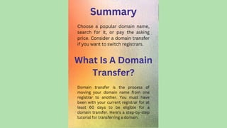 The document provides a comprehensive guide on transferring a domain name from one registrar to another, detailing eligibility requirements and step-by-step instructions. Key steps include updating contact information, unlocking the domain, obtaining an authorization code, and ensuring payment for the transfer. It emphasizes the importance of following the steps correctly to avoid disruptions to your website and suggests using Gauravgo for additional services and email optimization.