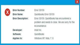 QuickBooks error code 30159 typically occurs when subscribing or updating QuickBooks, often due to an expired subscription, corrupted files, outdated software, or virus interference. This document outlines several solutions, including using system restore, the system file checker tool, and downloading Windows updates to rectify the error. For assistance, users can contact a helpline provided in the blog.
