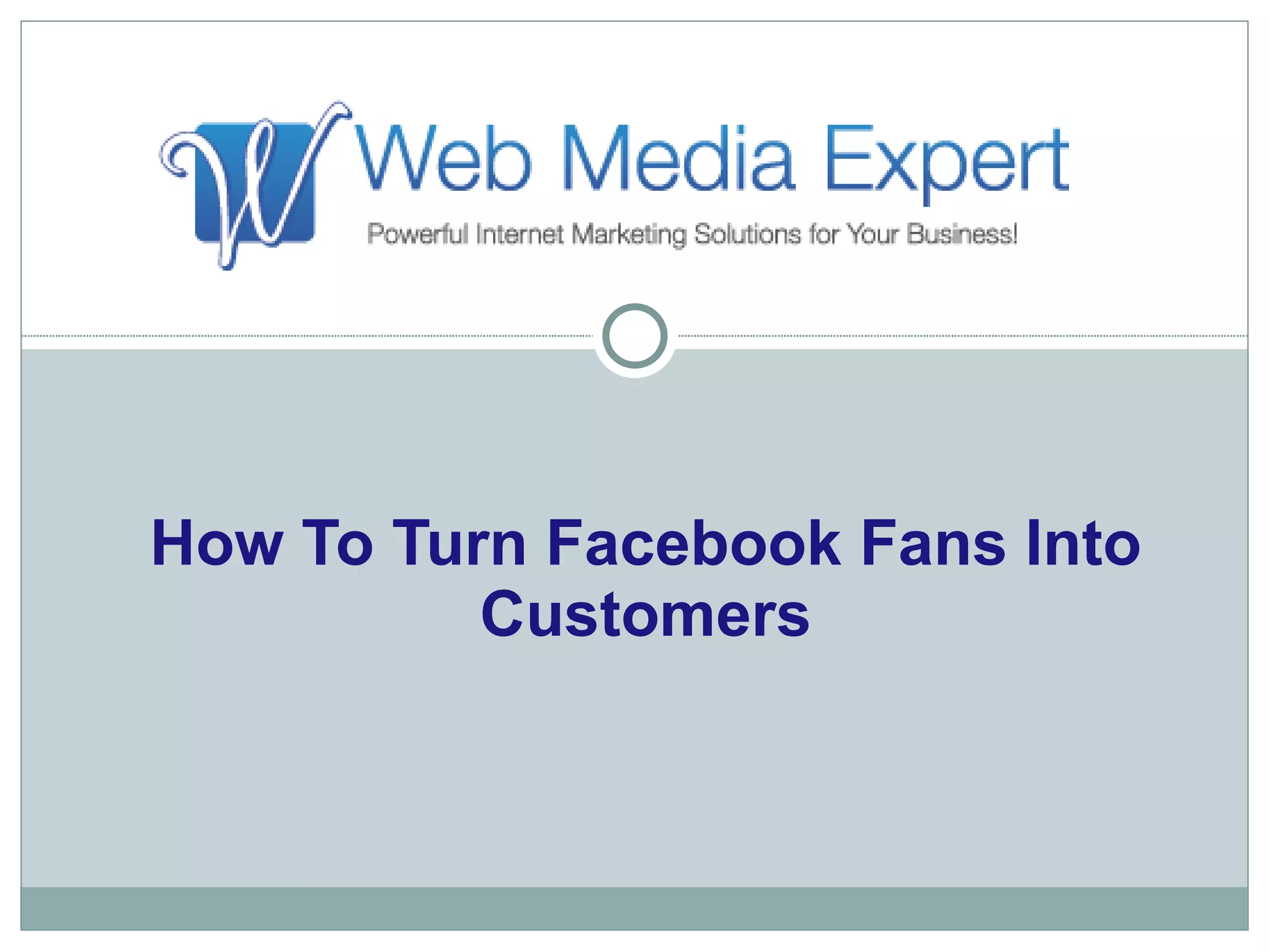 This document provides tips for using Facebook to turn fans into customers. It suggests engaging fans with quality content, keeping conversations going with questions, offering products for sale on Facebook, turning coupons into games to attract more fans, giving away free products or holding creative sweepstakes to generate interest, using lucky coupons or contests tied to email capture, and creating automated email responders to regularly offer deals to subscribers. The keys to success are offering unique prizes people want to win, giving non-winners a discount, and collecting leads through email signups. A social media agency can help with custom Facebook pages, campaigns, contests, email marketing, and more.