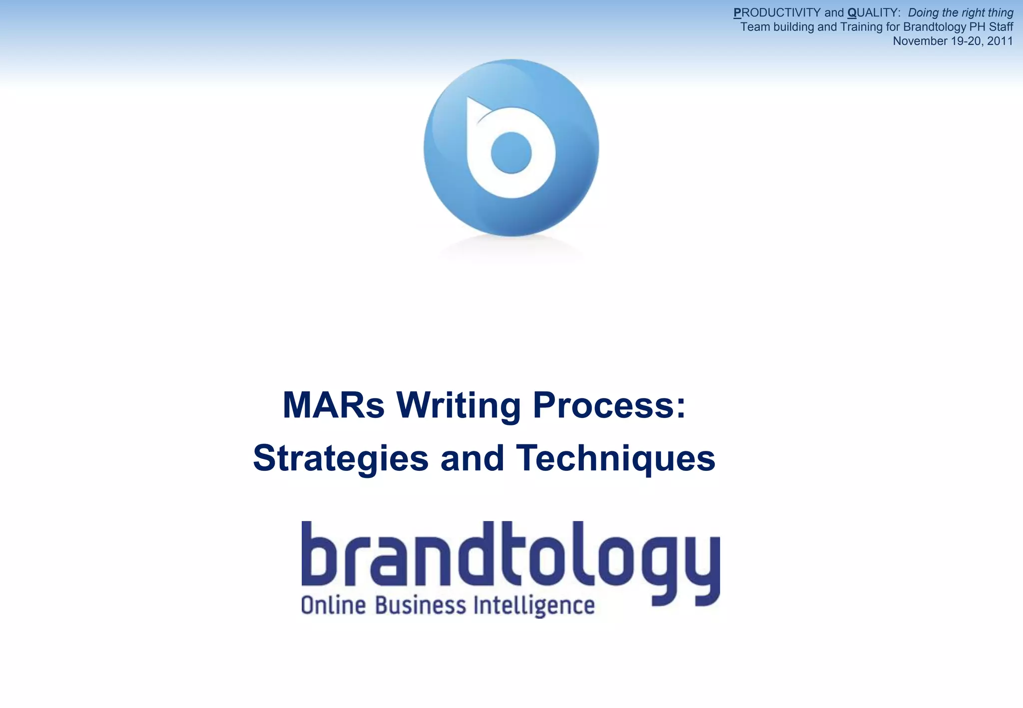 This document provides guidance for writing marketing activity reports (MARs) based on social media listening and insights. It discusses the MAR writing process, including pre-writing steps like portfolio reviews, industry research, and clustering ideas. Key points of listening to social media are outlined, like identifying complaints, compliments, influencers and crisis signals. Recommendations should be actionable, strategic and consider marketing perspectives. Post-writing steps involve proofreading and submitting the report to accounting managers. Disclaimers note that Brandtology is not responsible for the accuracy of social media information or subsequent business decisions made based on report insights.