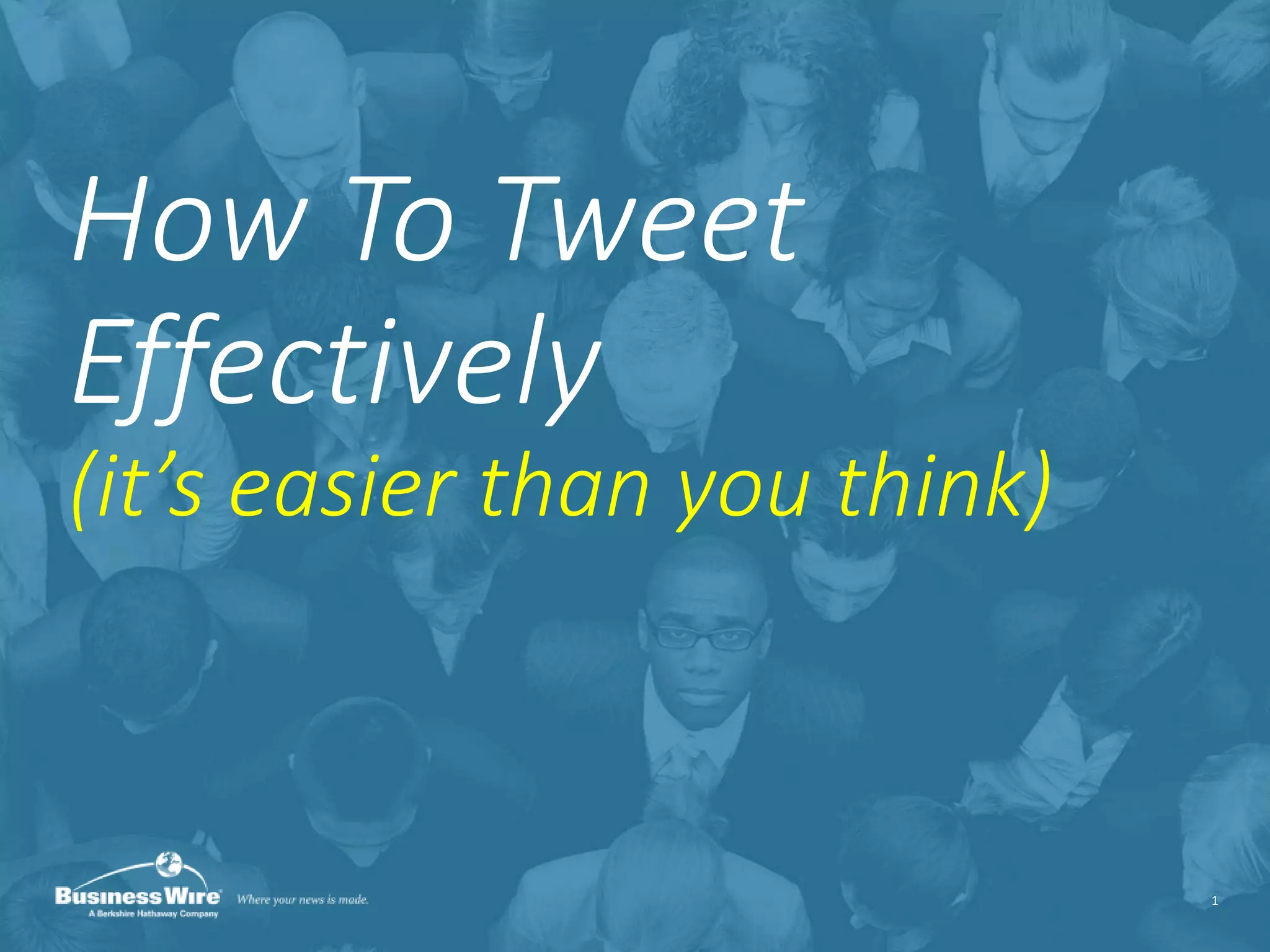 The document provides guidance on how to tweet effectively for business purposes. It recommends establishing goals and determining a brand voice before crafting a Twitter profile and tweets. Key suggestions include keeping tweets concise under 100 characters, including relevant hashtags and links, and researching the best times and days to post tweets. Creating Twitter lists of groups like competitors and industry experts and retweeting them is also advised. The document outlines best practices for formatting tweets, types of content that tend to engage audiences, and tools for analytics and engagement.