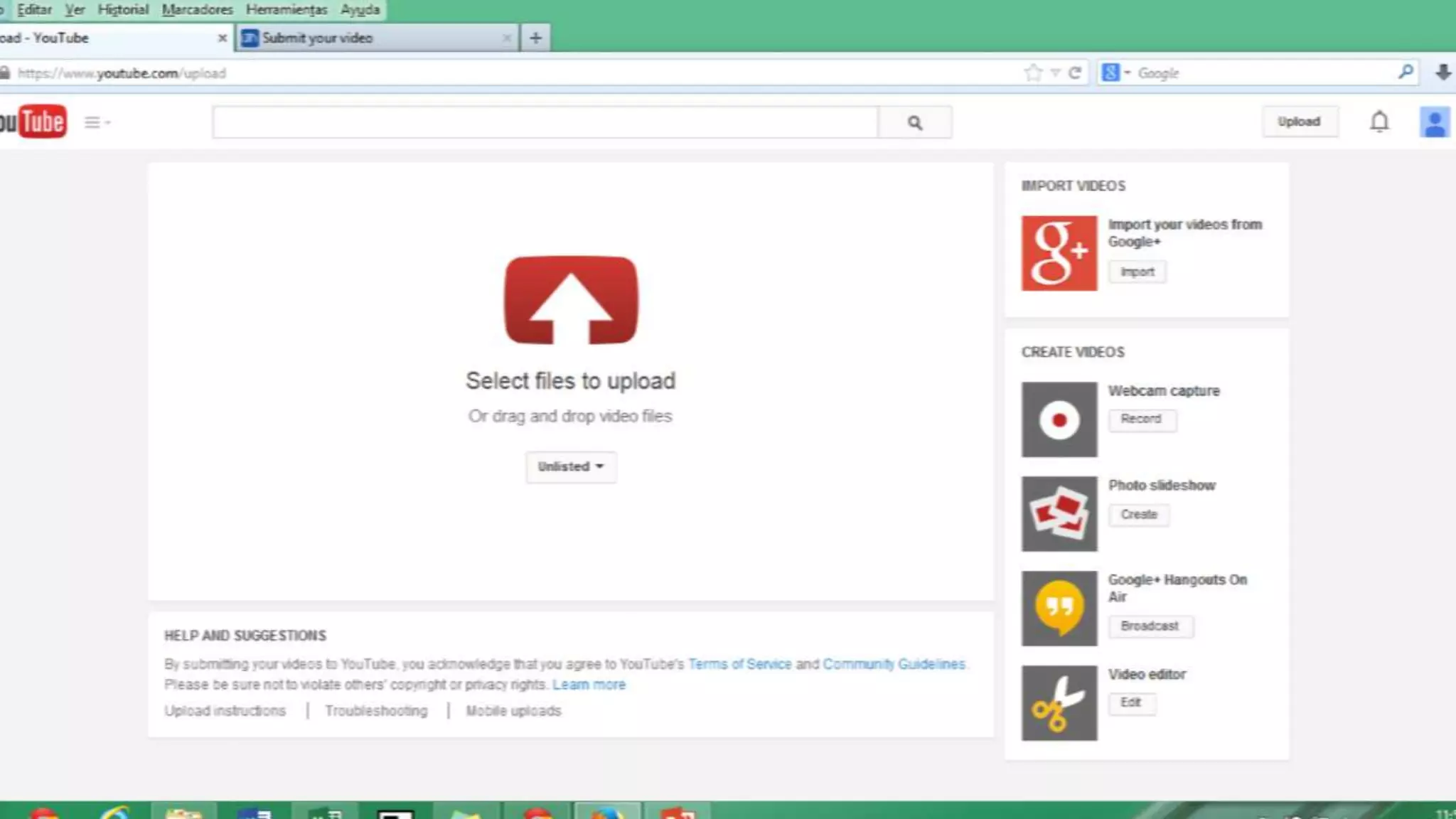 Log into your Google account and go to YouTube. Click the upload link to choose a video file from your device to upload. You can select to make the video unlisted so it is not publicly visible. Once the video finishes uploading, copy the URL link of the published video to share it on Aula Virtual.