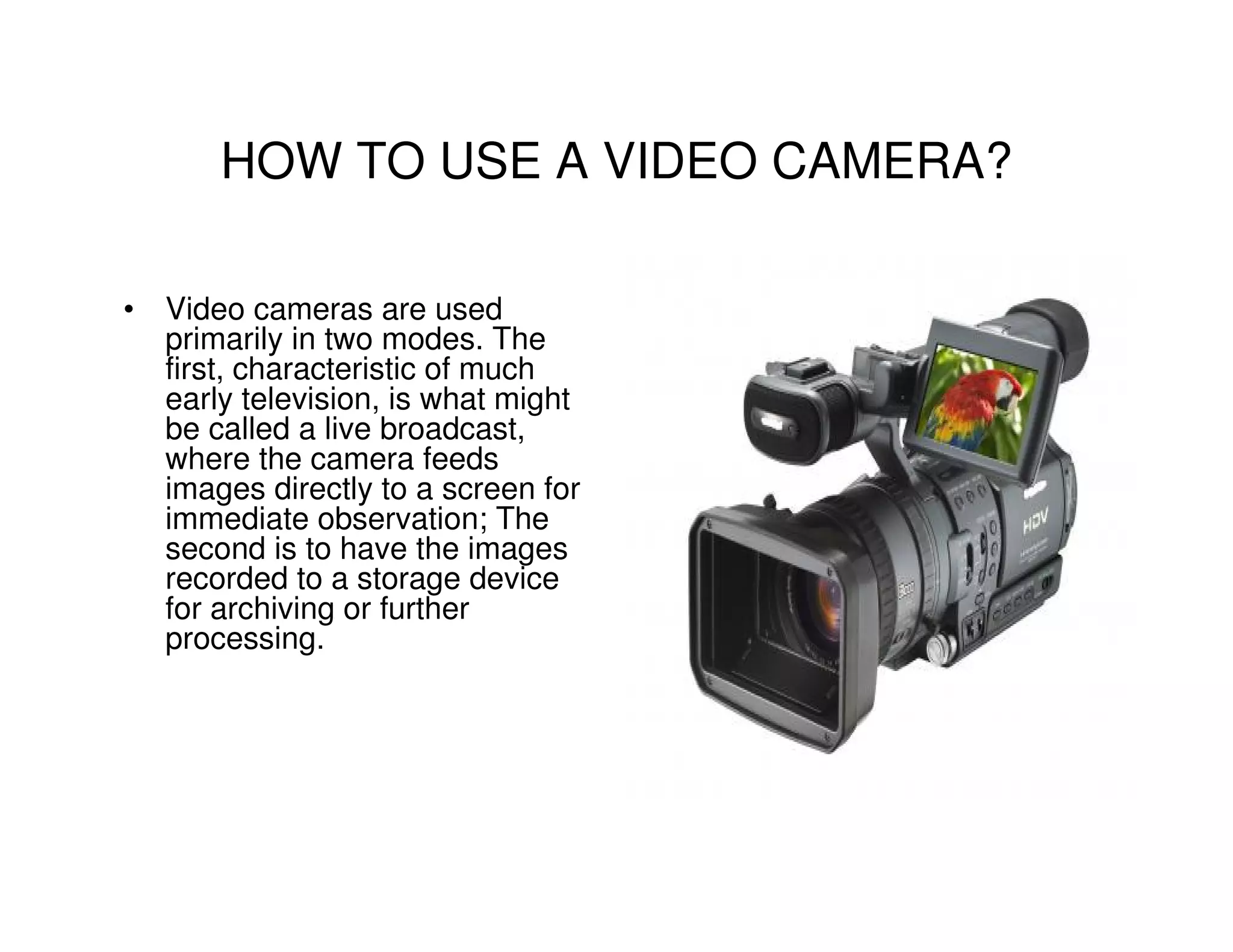 - Video cameras can record images and sound to storage like tapes or memory cards for later viewing or editing.