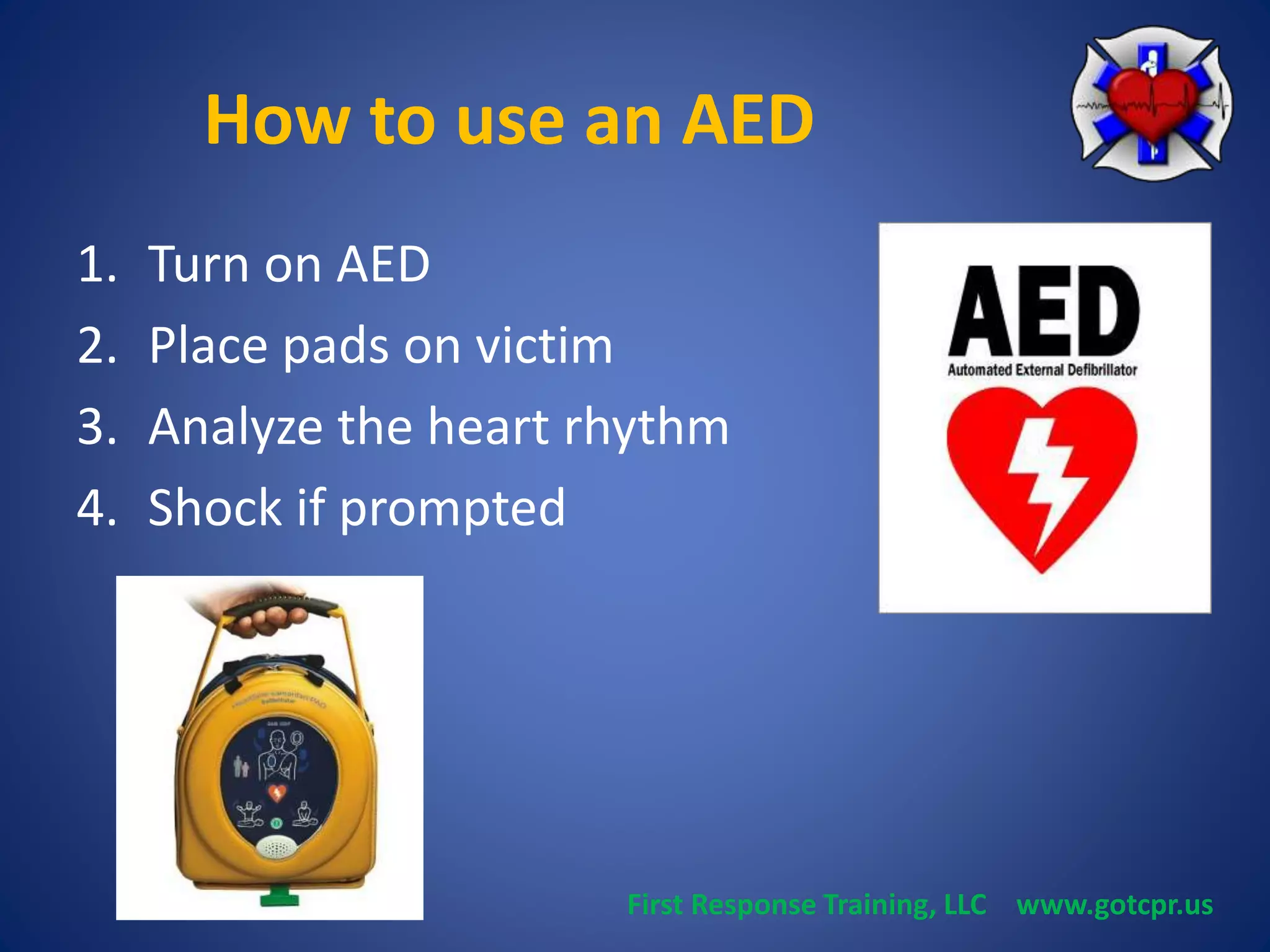 The document provides step-by-step instructions for how to use an Automated External Defibrillator (AED) in an emergency situation. The key steps include: 1) turning on the AED, 2) exposing and cleaning the chest, 3) attaching pads to the upper right and lower left areas of the chest, 4) allowing the AED to analyze the heart rhythm, 5) delivering a shock if prompted by the AED, 6) performing CPR as directed by the AED. Special considerations are also provided for using an AED on children, wet or hairy chests, individuals with pacemakers or bras.