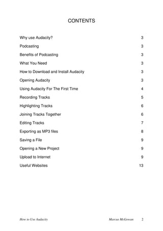 This document provides instructions for using the free audio software Audacity. It explains how to download and install Audacity, describes the basic interface and tools for recording, editing and exporting audio files. The document also provides examples of amplifying audio and joining tracks. Finally, it lists some websites for podcasting and uploading finished audio files to the internet.