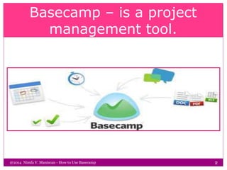 The document provides step-by-step instructions for setting up and using the project management tool Basecamp. It explains how to create a free trial account, set up a new project, add tasks and documents, schedule events, and view project activity and progress. Navigation of the different Basecamp sections like Discussions, To-Do lists, Calendar, and Search are demonstrated to help users get started with organizing and collaborating on projects using this online project management software.