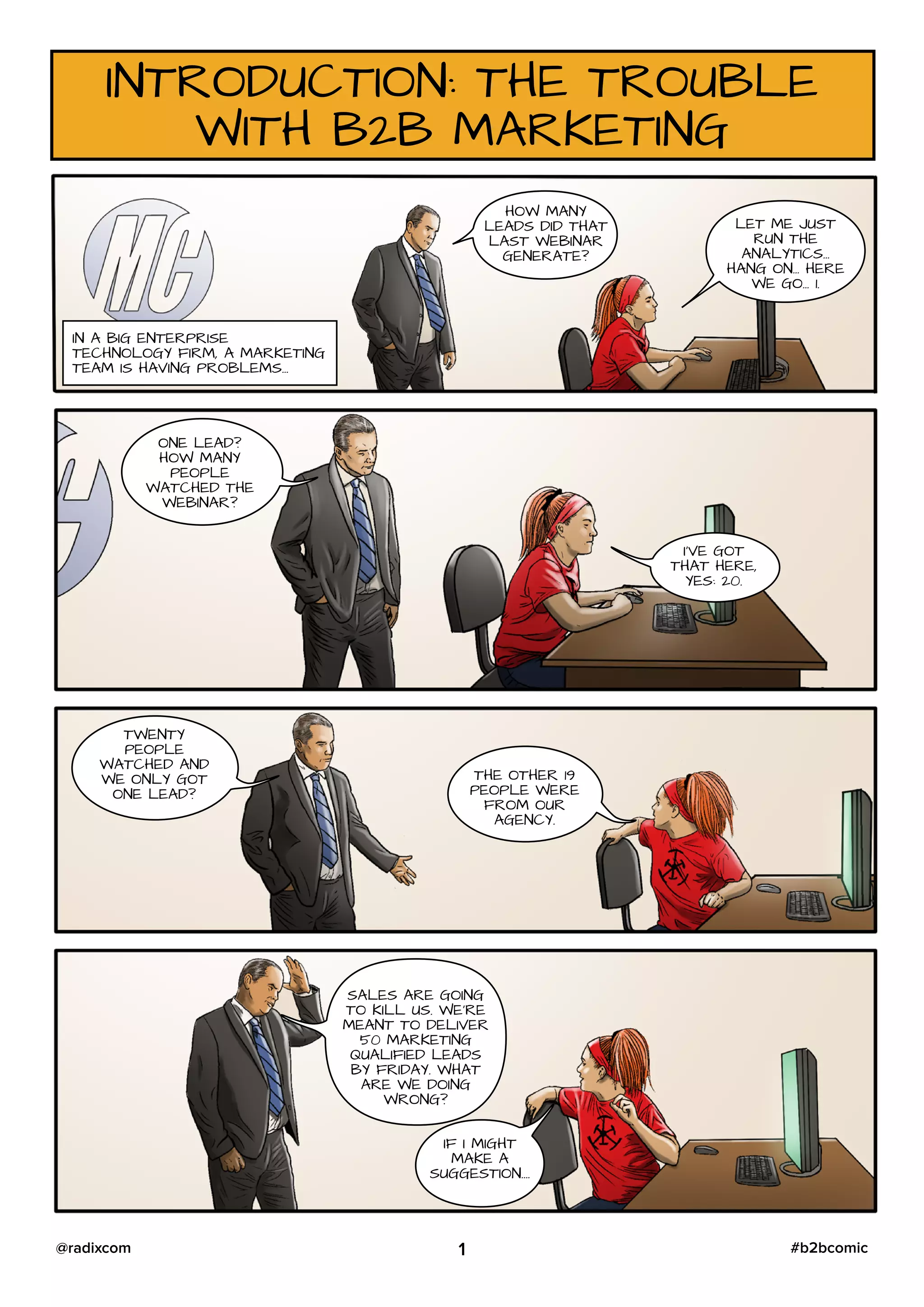 The document discusses the benefits of using comics in B2B content marketing, arguing that comics can effectively engage adult audiences by telling relatable stories and simplifying complex topics. It provides examples of successful comic usage in marketing by companies like Microsoft and Google and suggests various themes and techniques for creating comics. The authors encourage marketers to embrace this creative medium and offer their services to help develop comic content.