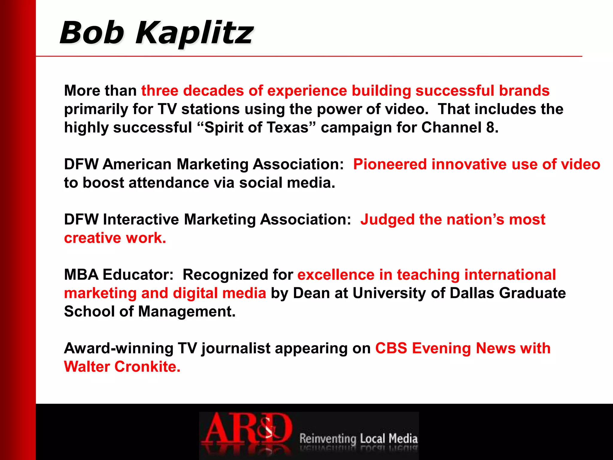 Bob Kaplitz discusses developing video marketing strategies using one-to-one engagement. With over 31 years of audience research experience, he helps build brands through engaging stories on social media and emerging technologies. Kaplitz has experience boosting attendance for a TV station using innovative video on social media. He teaches international marketing and digital media. Kaplitz's presentation focuses on creating concise videos for multiple platforms like mobile, email and websites to increase recognition, reputation and revenue through targeted messages.