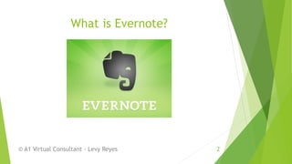 Evernote is a note-taking software that allows users to create different types of notes including text, webpages, photos, audio and video. Notes can be organized into notebooks which can then be shared with others. The document provides a step-by-step tutorial on how to sign up for an Evernote account, download the software, create different types of notes, organize notes into notebooks, and share notebooks. It also discusses additional tools and add-ons that can be used with Evernote.