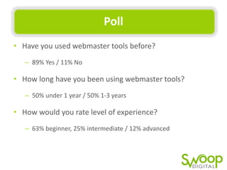 Carol Poole's presentation on Webmaster Tools highlights its importance for webmasters and SEO professionals in improving website visibility, health, and user experience. Key features include sitemap submission, fixing crawl errors, and analyzing search queries. The document also discusses the tools available for different purposes, as well as valuable resources and tips for using the tool effectively.