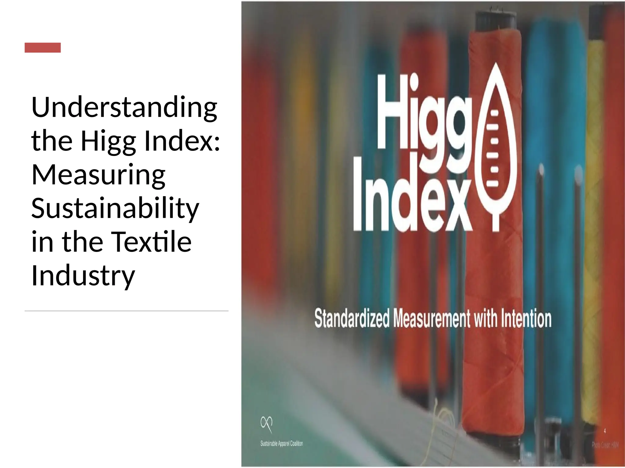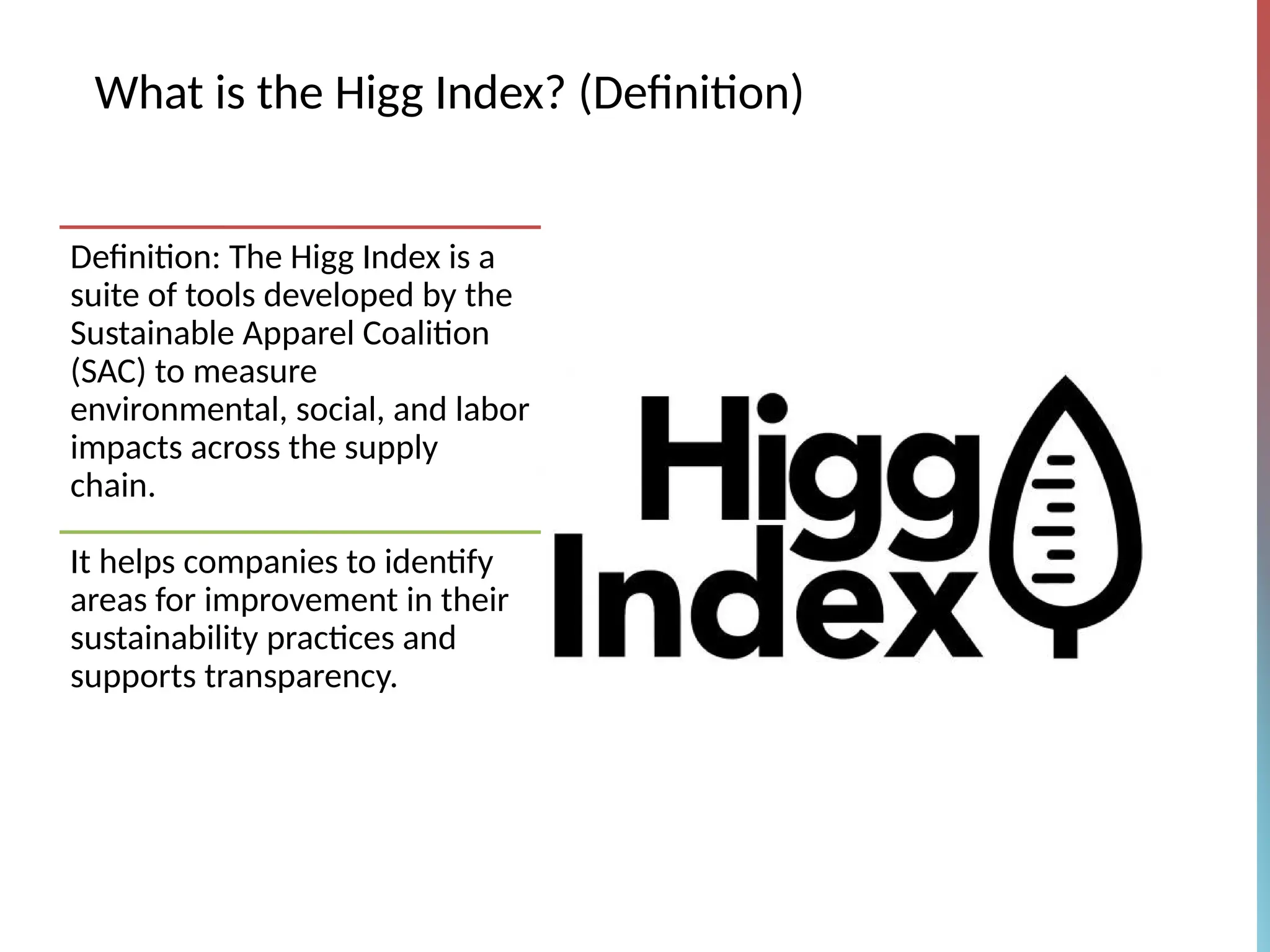 The Higg Index, developed by the Sustainable Apparel Coalition, is a suite of tools for measuring sustainability impacts in the textile industry, focusing on environmental, social, and labor factors across the supply chain. It provides a standardized framework to help companies improve their sustainability practices and meet consumer demand for transparency. Key components include various modules assessing facility-level environmental impacts, social and labor performance, and product lifecycle impacts, with an emphasis on continuous improvement and data-driven decision making.