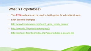 This document provides information on how to use the software Hotpotatoes to create educational games. Hotpotatoes allows you to make 6 types of games - JCloze for fill-in-the-blank, JMatch for matching, JQuiz for multiple choice quizzes, JCross for crosswords, JMix for rearranging sentences, and JMemory for memory games. The document explains how to download Hotpotatoes, create games of each type by adding questions, answers, and options to edit colors and text. It also provides examples of games created with Hotpotatoes and suggests making a page with links to all games.