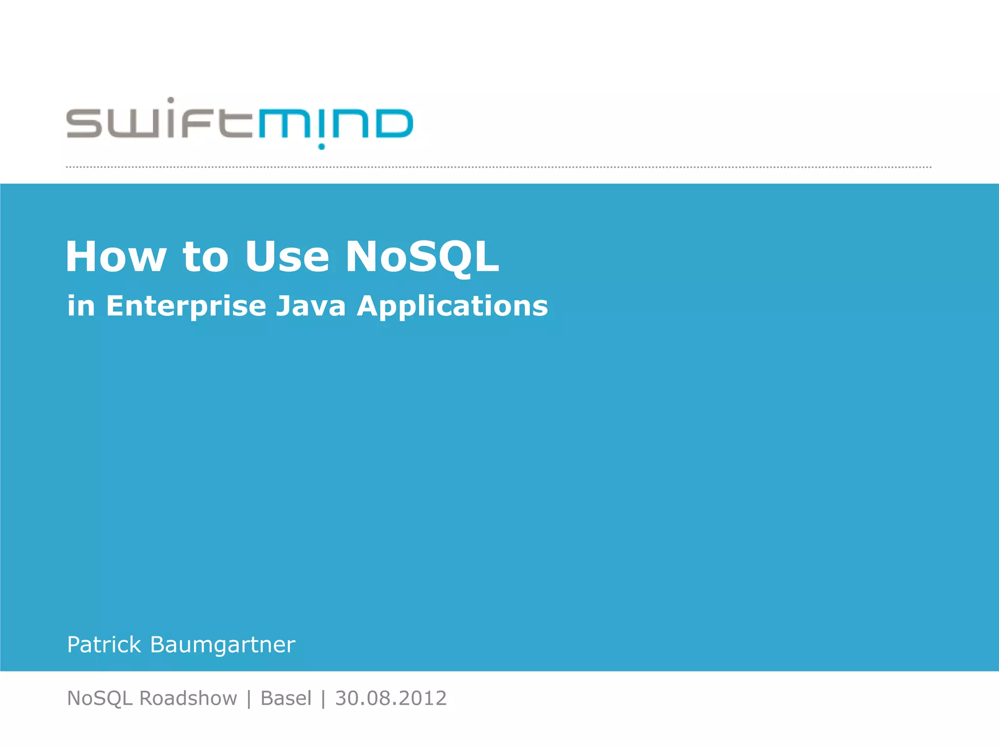 The document is a presentation by Patrick Baumgartner on the integration of NoSQL data stores in enterprise Java applications, highlighting new demands for data access and various types of data stores. It provides an overview of Spring Data, including its key features and examples utilizing MongoDB and Neo4j. The presentation concludes with a Q&A session and resources for further exploration.