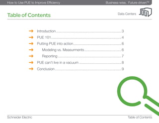 This document discusses how to use power usage effectiveness (PUE) to improve data center efficiency. PUE is a ratio that measures how efficiently a data center uses energy, with a lower PUE indicating higher efficiency. The document recommends establishing a PUE baseline and then monitoring PUE over time to identify areas for improvement. Mathematical models can help analyze the impact of changes on PUE and estimate efficiency under different conditions. Taking a holistic approach by integrating PUE with other metrics in a dashboard provides the best context for efficiency analysis and cost reduction.
