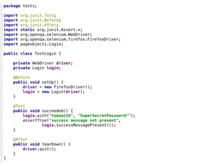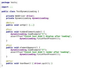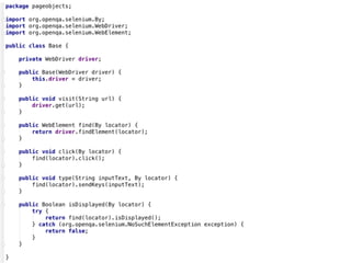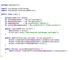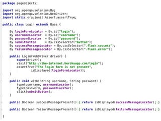 The document outlines a comprehensive guide for using Selenium to write business-relevant, reusable, and maintainable tests across various browsers. It provides a structured approach through ten steps, including defining a test strategy, selecting a programming language, utilizing Selenium fundamentals, and preparing for cross-browser execution. Additionally, it emphasizes the importance of building an automated feedback loop to identify failures early in the development process.