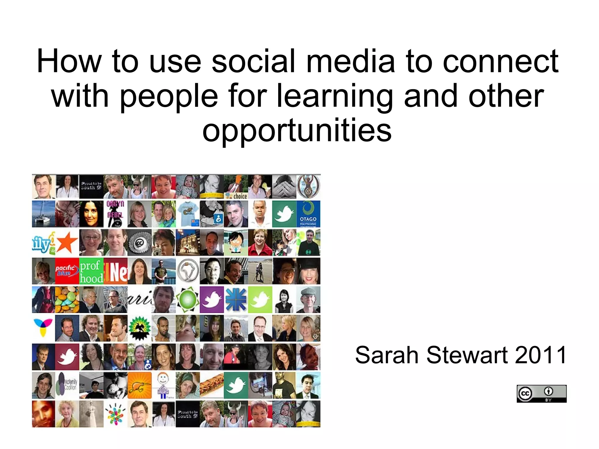 This document provides tips for using social media to connect with people and opportunities for learning from Sarah Stewart. It lists her roles and areas of expertise, projects she has worked on, tools she uses for social media including blogs, Twitter, Facebook and Wikispaces. It also lists 10 tips for successful networking and connecting through social media such as being consistent in branding yourself, focusing on quality over quantity, and responding to people who contact you. Contact information is provided at the end.