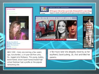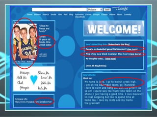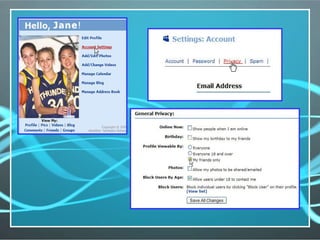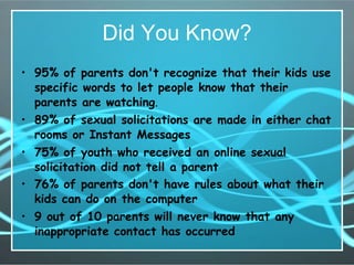 The document discusses ensuring safety for students while using the internet. It provides statistics showing many youth encounter online risks like sexual solicitation. It notes most parents are unaware of these dangers or don't have rules for internet use. The document then gives tips for staying safe such as not sharing private information, using privacy settings carefully, and being wary of online relationships. Students are advised to talk to trusted adults if anything makes them feel unsafe online and to respect copyright laws.