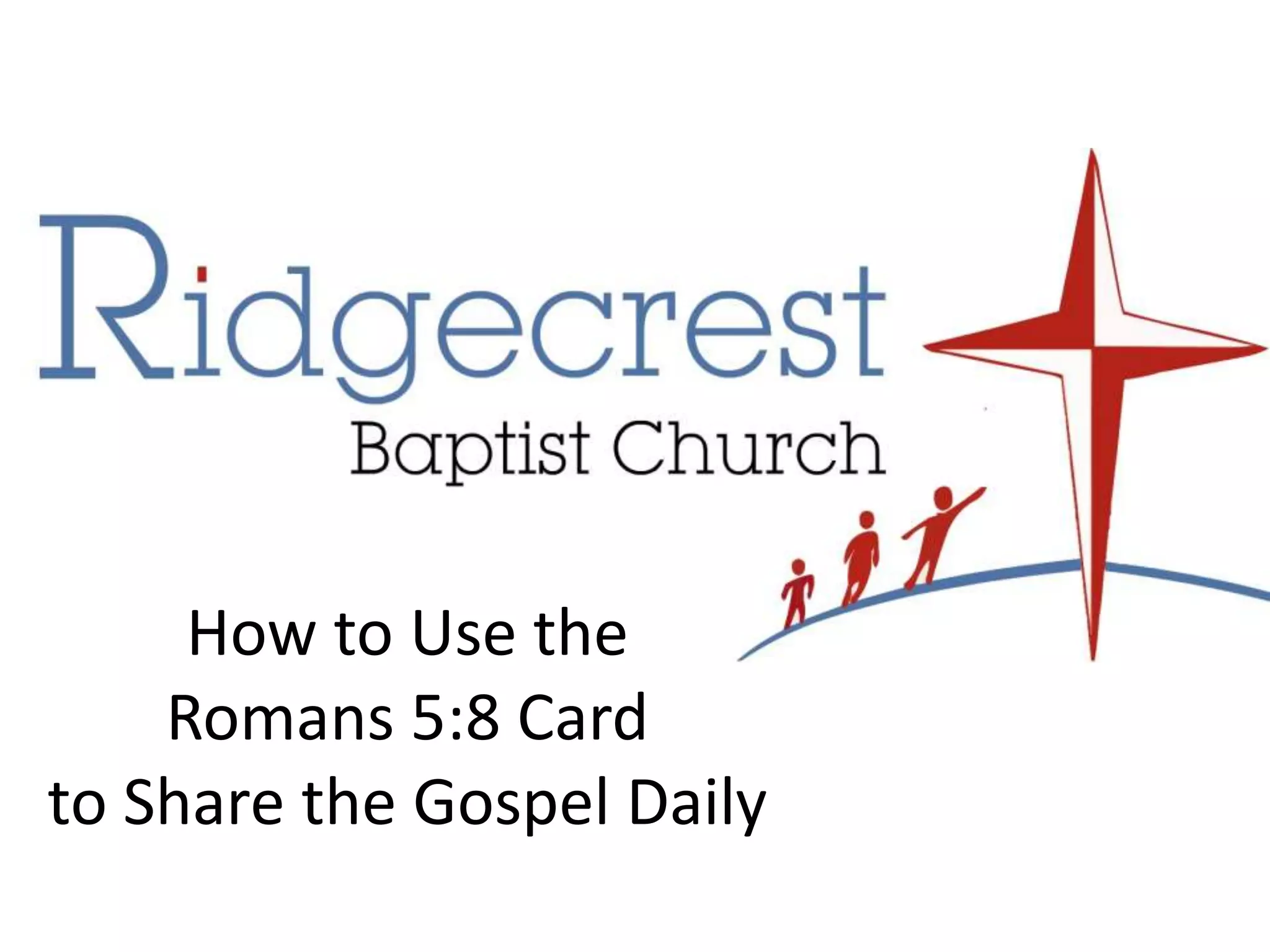 This document provides guidance on how to use Romans 5:8 to share the gospel message daily. It recommends inviting people to church and drawing their attention to the verse on the back of a card that states "But God shows his love for us in that, while we were still sinners, Christ died for us." It then outlines steps to share the gospel using the verse, including asking a question, answering from the verse, sharing the gospel message of sin, Jesus as savior, and making a call for repentance and faith, followed by a sample prayer. It concludes with discipleship recommendations like encouraging Bible reading and inviting people to attend worship and a community life group.