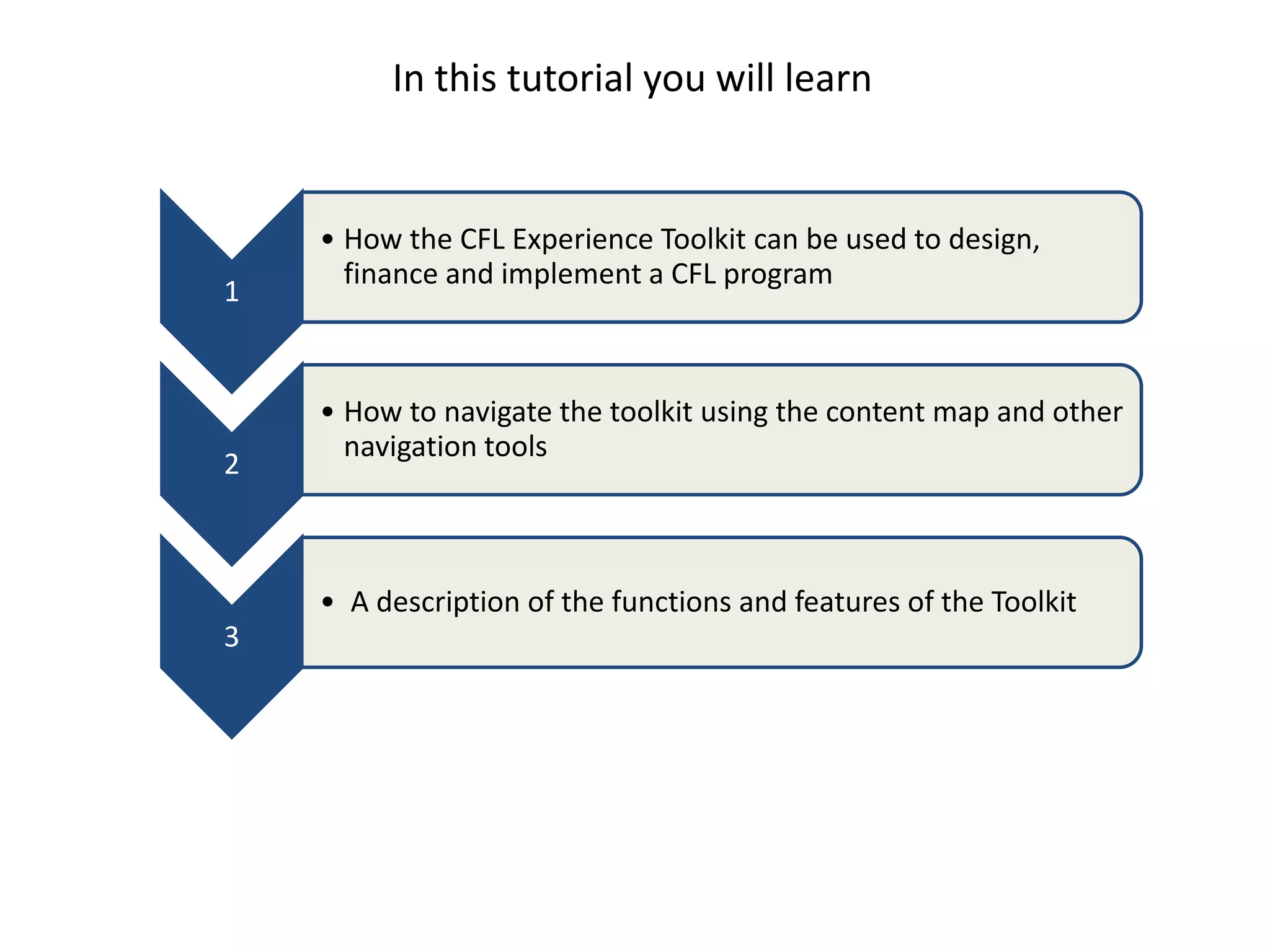 This document provides an overview of the CFL Experience Toolkit, which is designed to guide users through the process of designing, financing, and implementing compact fluorescent lamp (CFL) programs in developing countries. It describes the main sections and navigation tools of the toolkit. The toolkit contains (1) a step-by-step guide to walk through each phase of a CFL program, (2) case studies of existing CFL programs, and (3) a knowledge center with technical specifications, templates, and other resources. The goal is to educate users on best practices and provide resources to help plan and execute their own CFL programs.