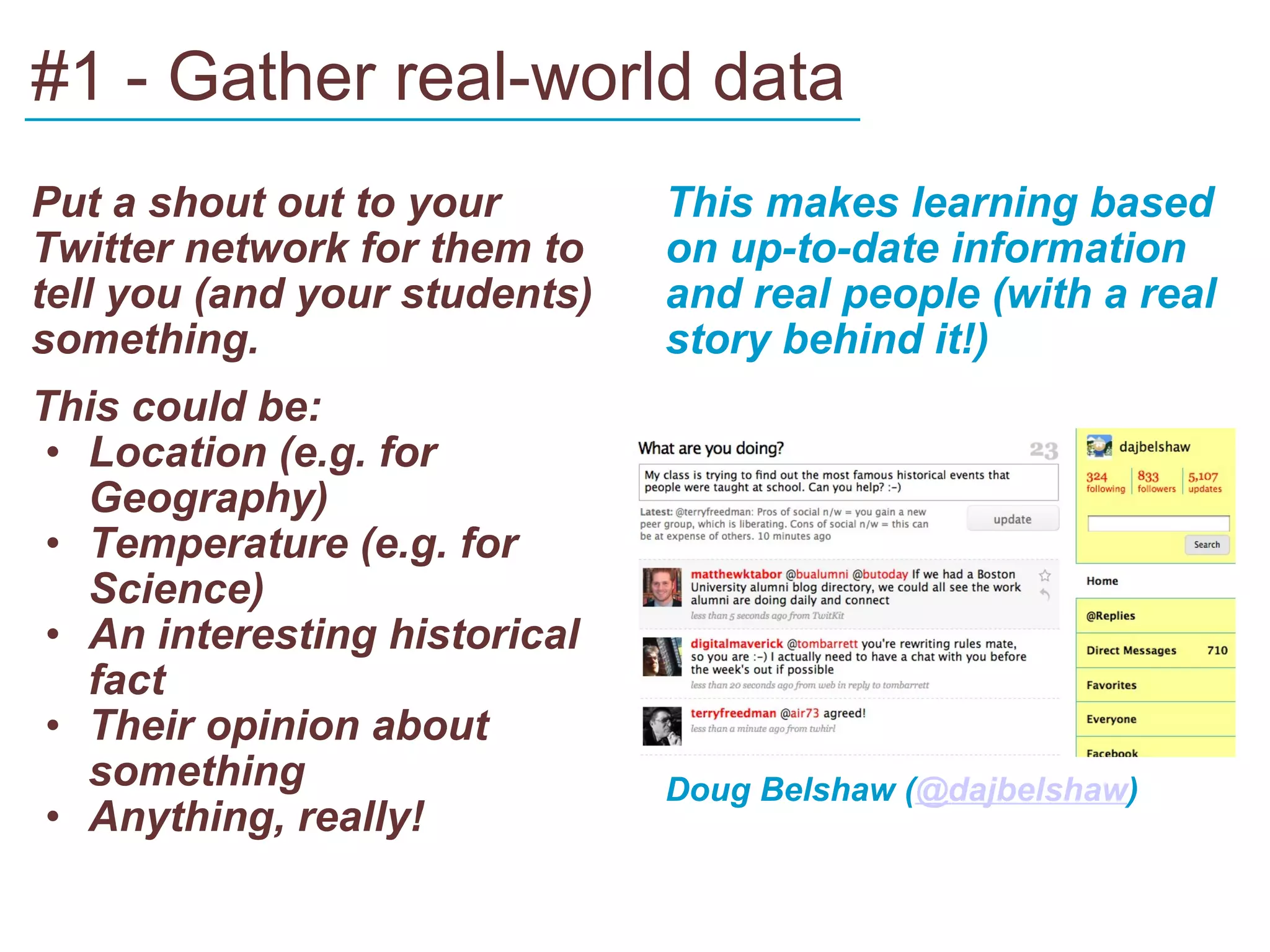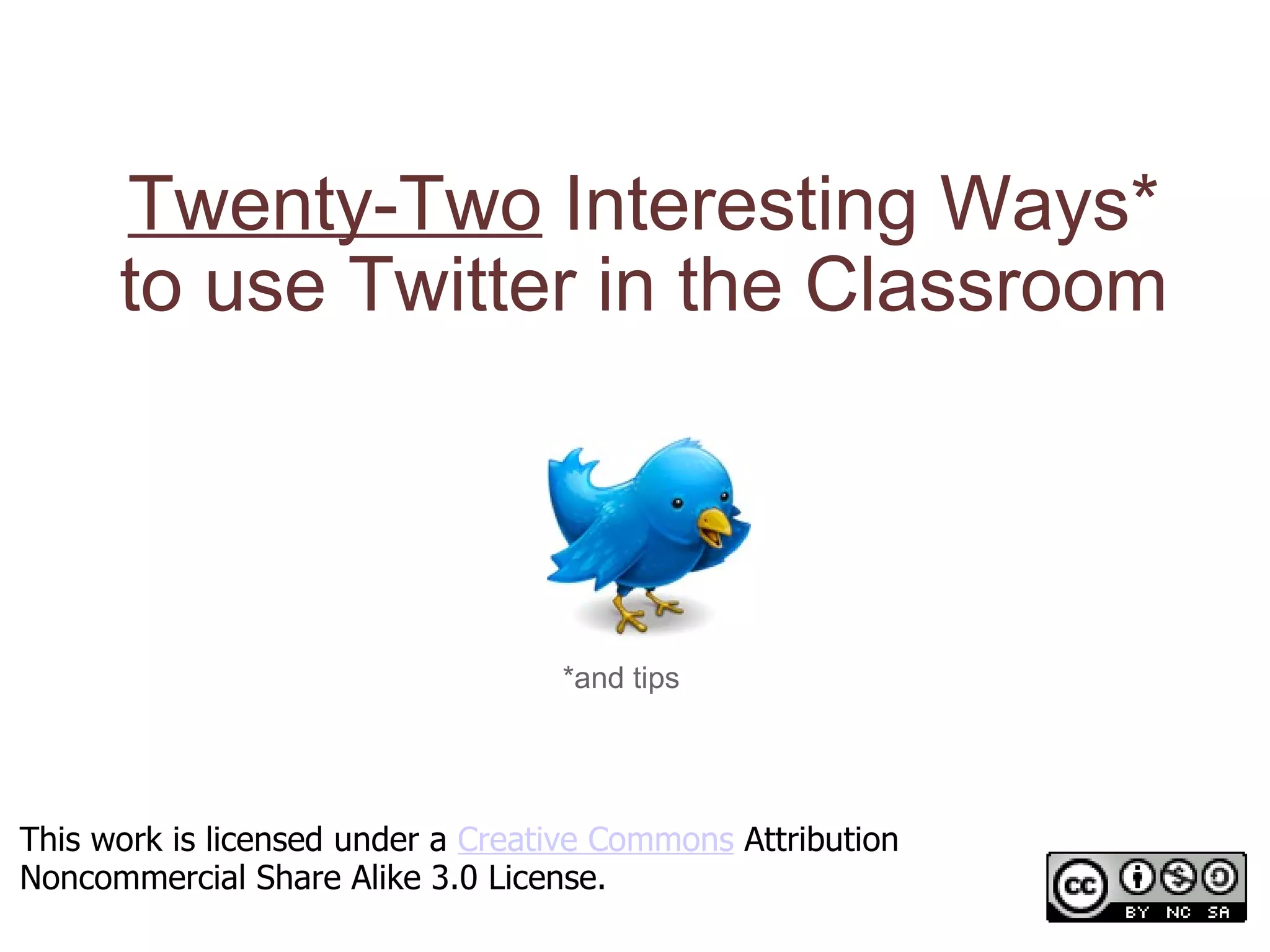 The document lists 22 ways that Twitter can be used in the classroom, along with brief explanations. Some examples include having students gather real-world data from their Twitter networks; using hashtags and keywords to monitor buzzwords and topics; summarizing ideas in tweets; collaborating on storytelling; polling classmates' opinions; and connecting with experts online. Twitter allows sharing information, resources, and ideas both locally and globally.