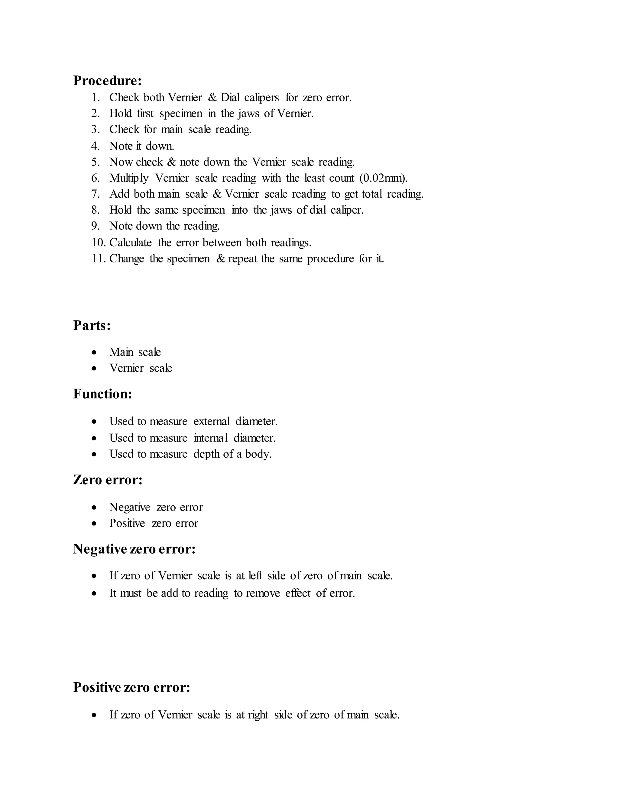 This document describes how to use a Vernier caliper to take measurements. It defines true value as the average of infinite measurements with zero average deviation, while measured value is the approximated true value found from multiple readings. Static error is the difference between measured and true values. The procedure explains how to check for zero error, take main and Vernier scale readings, calculate the measurement using least count, and record results from different specimens. Precautions include cleaning the caliper and items measured to minimize errors and get accurate readings.