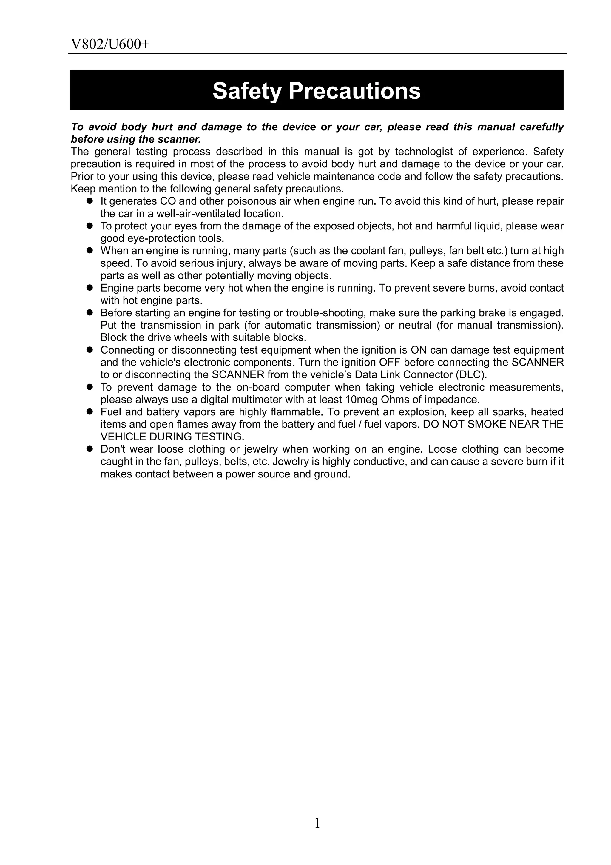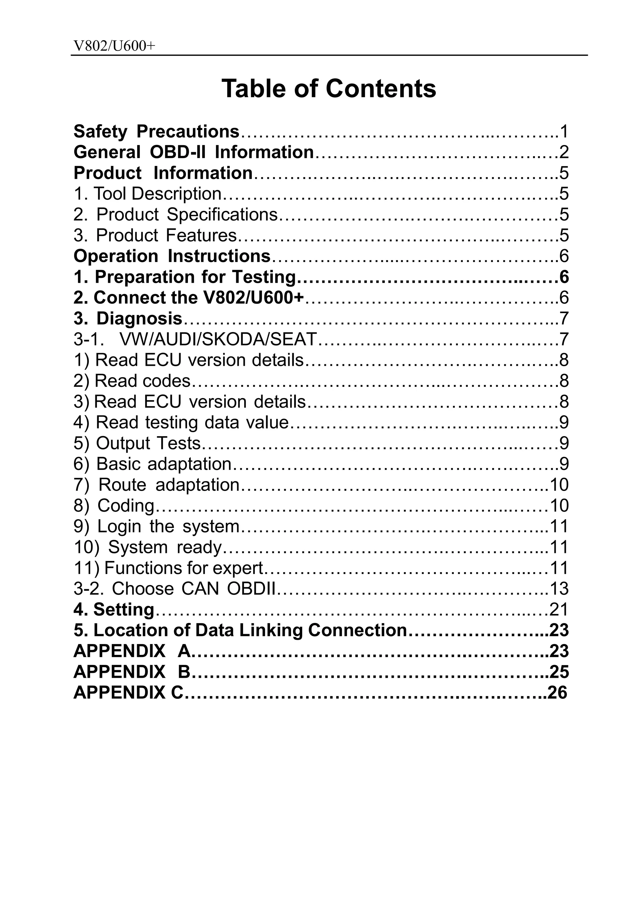 The document is a comprehensive manual for the v802/u600+ diagnostic tool that covers safety precautions, OBD-II information, product specifications, and operation instructions. It emphasizes the importance of adhering to safety measures while using the tool and provides detailed steps for connecting the device to vehicles for diagnostics. Additionally, it outlines how to navigate the tool's functionalities related to various vehicle systems, focusing on VW, Audi, Skoda, and Seat models, and offers guidance on troubleshooting and clearing fault codes.