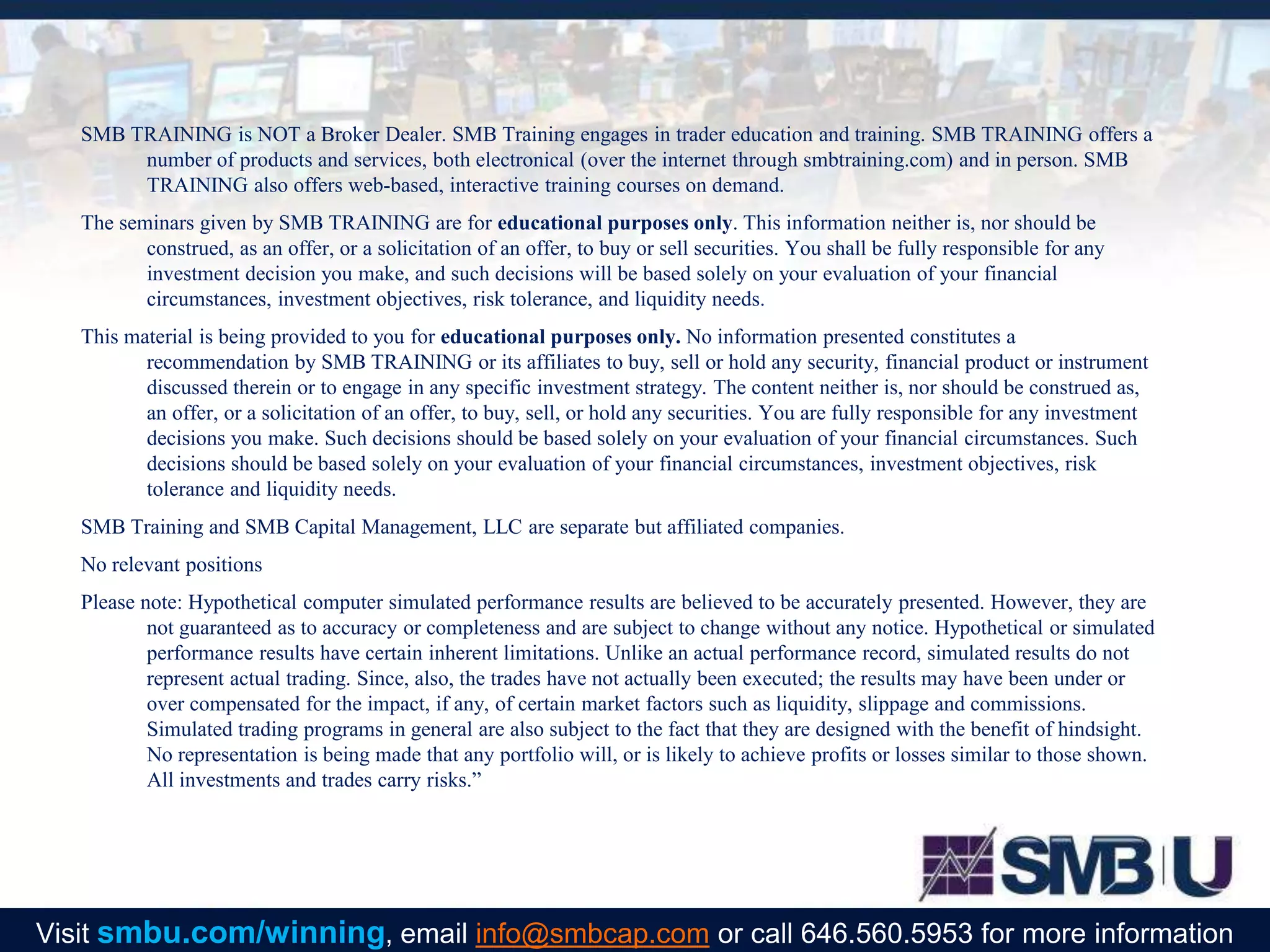 The document discusses the stock trading strategies and performance reviews for a specific trading scenario, focusing on the importance of managing trades effectively. It highlights that trading decisions should be based on one’s own financial circumstances and risk tolerance, emphasizing education in trading practices. Additionally, it notes that simulated performance results do not guarantee actual trading outcomes and carry inherent risks.