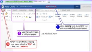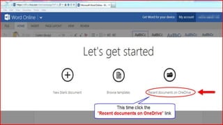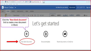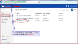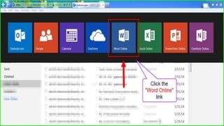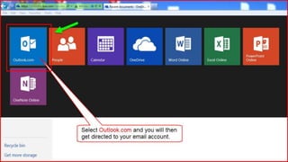 This document provides instructions for accessing and using Microsoft Word documents through an Outlook, Hotmail, or MSN email account. It explains that Word Online can be accessed for free using one of these accounts, as they are all part of Microsoft. It then demonstrates how to log into an existing account, access Word Online through the account, save Word documents, and attach them to emails to share them. The instructions are intended to teach users how to create, edit, save, and send Word documents remotely using only an internet connection and email login credentials.