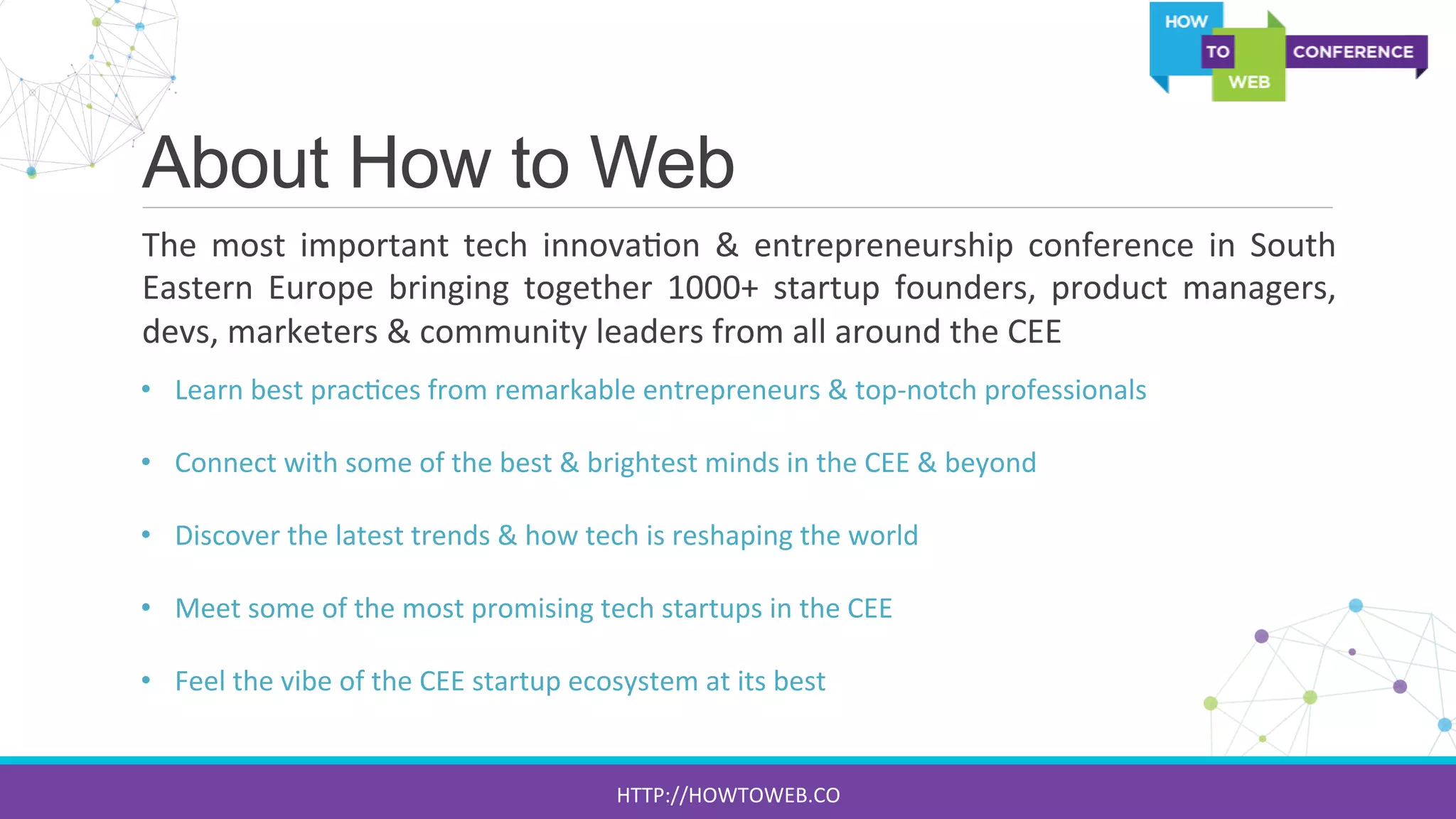 How to Web is a prominent tech innovation and entrepreneurship conference taking place on November 26-27, 2015, in Bucharest, bringing together over 1000 participants from the CEE startup ecosystem. The event features renowned entrepreneurs, technical specialists, and marketers sharing best practices and insights into the latest trends in technology. It aims to foster connections and mentorship for startups, highlighting the vibrancy of the regional tech community.