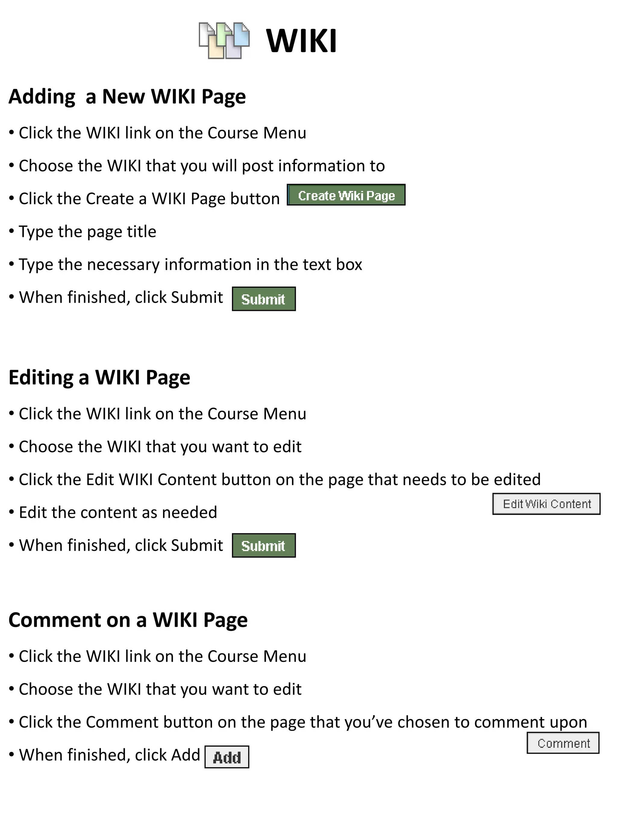 To add a new wiki page, click the wiki link and choose a wiki to post to. Type a title and content then click submit. To edit an existing page, choose the wiki, click edit, make changes and submit. To comment, choose a wiki page and click comment, type a comment and click add.