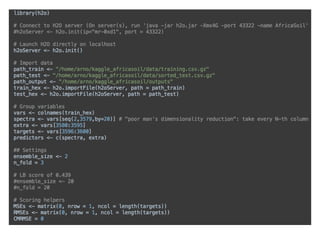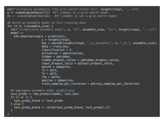This document summarizes a presentation about how to win data science competitions using deep learning with H2O. It discusses H2O's architecture and capabilities for deep learning. It then demonstrates live modeling on Kaggle competitions, providing step-by-step explanations of building and evaluating deep learning models on three different datasets - an African soil properties prediction challenge, a display advertising challenge, and a Higgs boson machine learning challenge. It concludes with tips and tricks for deep learning with H2O and an invitation to the H2O World conference.