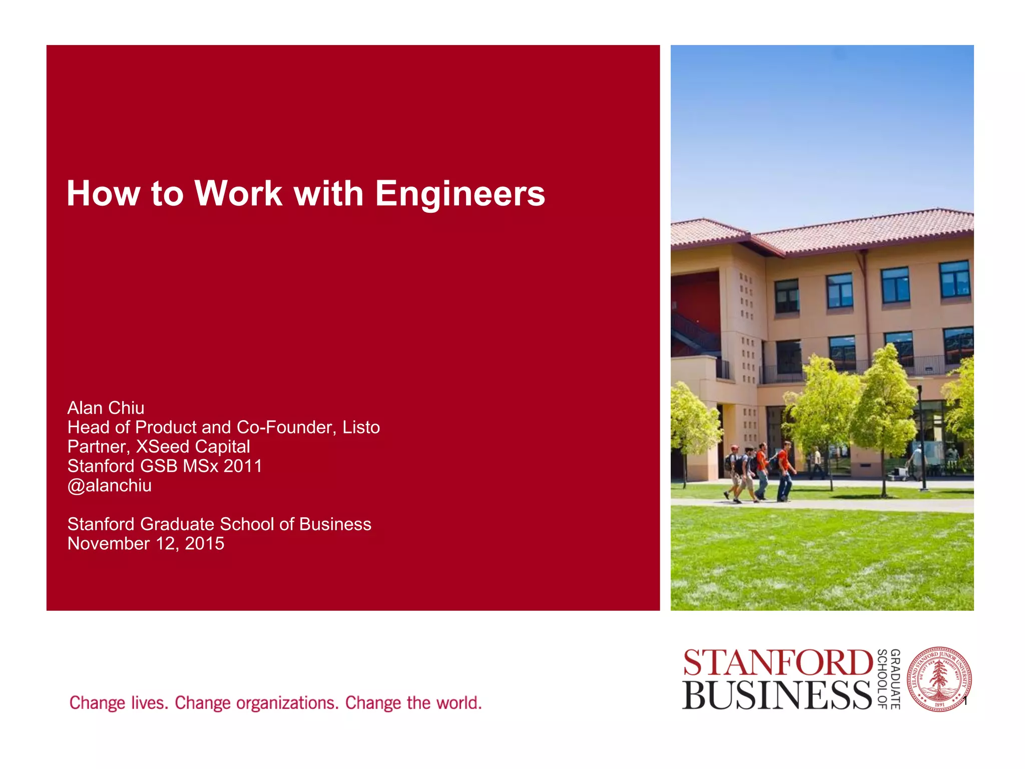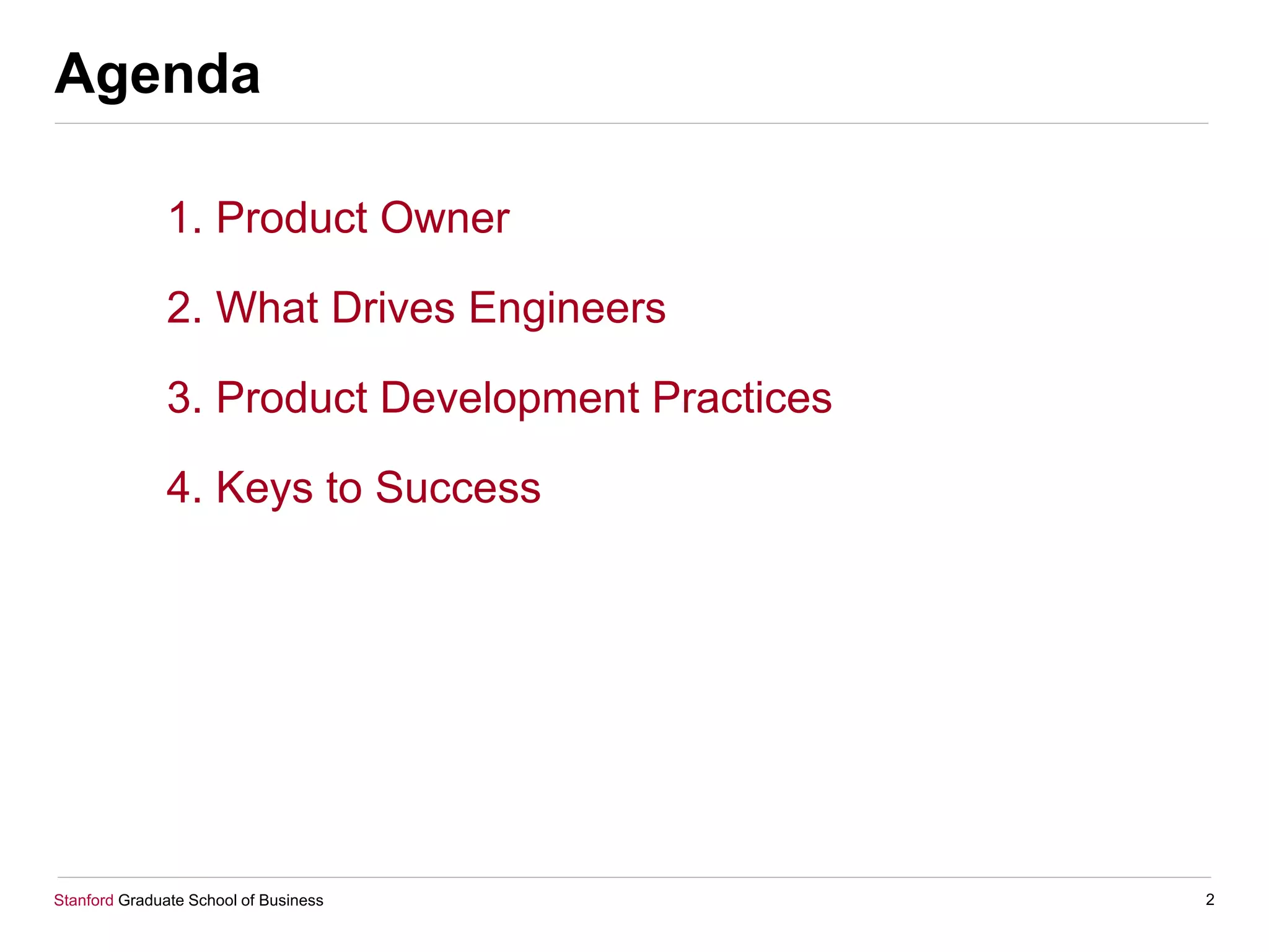 The document discusses best practices for collaborating with engineers, emphasizing the role of the product owner in ensuring product-market fit and understanding engineers' motivations. It outlines the importance of adopting agile development practices alongside customer development to foster better collaboration and quality outputs. Keys to success include being the voice of the customer, ranking features by value, and including non-engineers in decision-making processes.