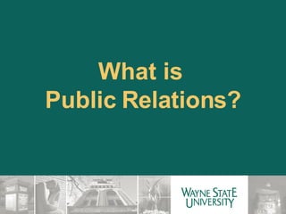 The document provides guidance on maximizing public relations potential through a well-executed PR strategy at Wayne State University. It outlines key publics to engage, benefits of good PR like increased prestige and funding, and tactics for individual schools/colleges to reinforce the university's image through media relations, identifying opportunities, and aligning messages with university goals. Specific tips are provided for pitching stories to media, developing materials, securing coverage of events, and leveraging coverage.