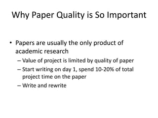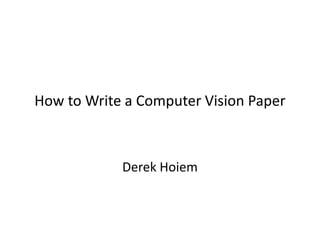 This document outlines essential strategies for writing a high-quality computer vision paper, emphasizing the importance of starting early and dedicating a significant portion of the project to writing. Key components include crafting a compelling introduction, effectively describing algorithms, supporting claims with experimental results, and addressing reviewers' potential criticisms. The document advises maintaining clarity and focus throughout the writing process to enhance the chances of acceptance.