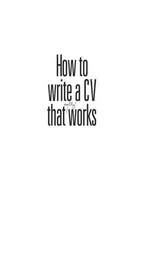 The document discusses how a CV is an important marketing tool that highlights one's skills, achievements, and experience in order to motivate potential employers to meet with the job applicant. It emphasizes that the goal of a CV is not to secure a job directly, but rather to lead to an important interview or meeting. The reader is encouraged to view their CV as their personal sales brochure that sells themselves to potential employers or clients.