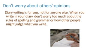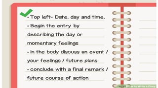 This document provides guidance on writing engaging diary entries, emphasizing creativity, detail, and personal feelings over strict adherence to spelling and grammar. Key steps include being descriptive, using the first person, and incorporating visuals, alongside a structure that includes a date and organized paragraphs. It also introduces a lesson plan for writing a diary entry based on the historical figure Grace Darling, encouraging emotional expression and the use of vivid vocabulary.