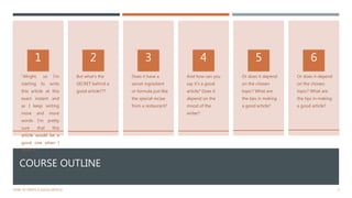 The document provides tips for writing a good article. It states that writing an article does not require any secret skills or formula; you mainly need yourself, your mental presence when writing, and comfortable writing materials. Some key tips discussed include knowing your topic well, having a framework of ideas to serve as a plan, and making the article understandable to readers by putting yourself in their perspective. The benefits of writing a good article are that it draws in more visitors, traffic, and page views, improving your reputation. The secrets to effective article writing are being yourself and focusing on understandability rather than relying on any secret skills or formulas.