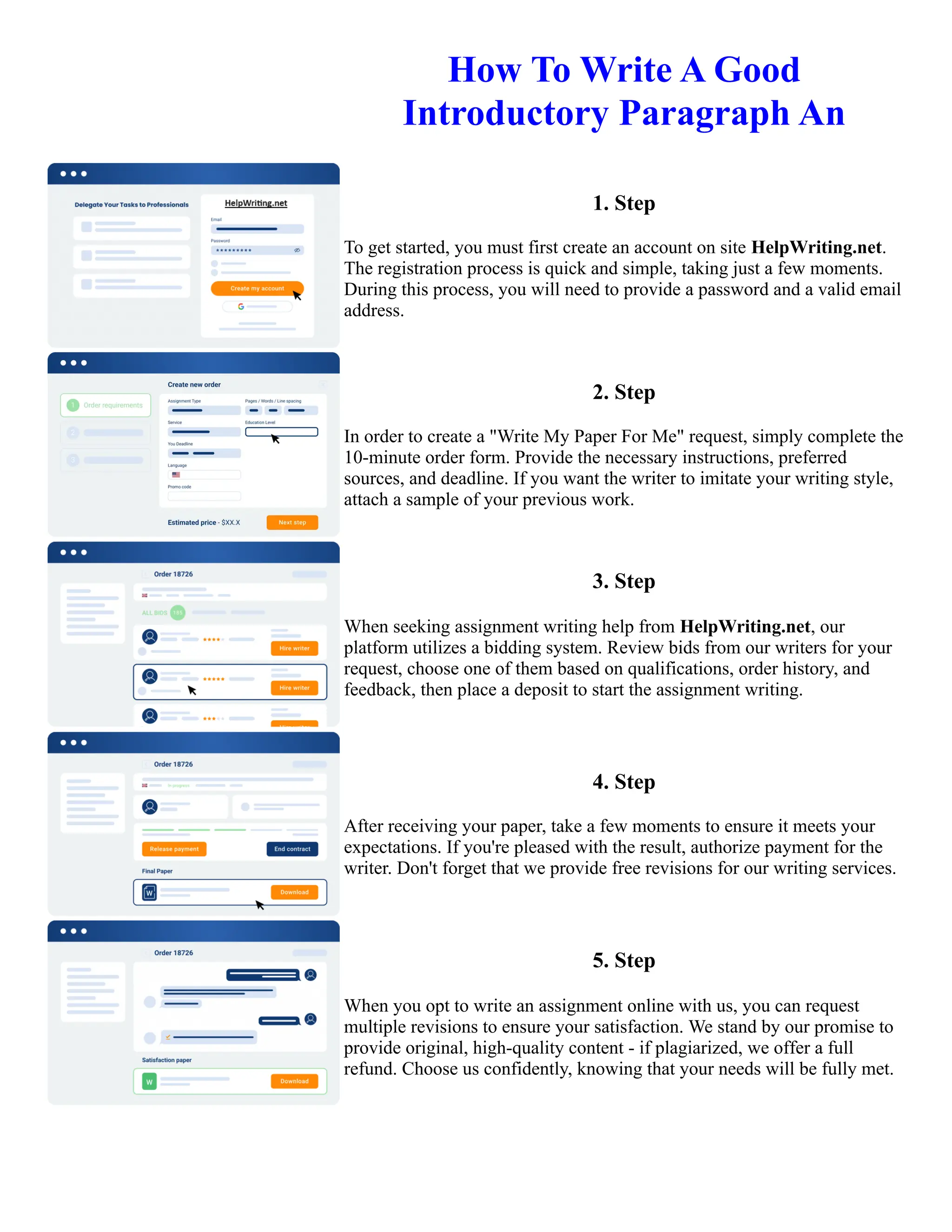 The document provides instructions for submitting a writing request to the website HelpWriting.net. It outlines a 5-step process: 1) Create an account with a password and email. 2) Complete a 10-minute order form providing instructions, sources, and deadline. 3) Review bids from writers and choose one based on qualifications. 4) Review the completed paper and authorize payment if satisfied. 5) Request revisions to ensure satisfaction, and the company offers refunds for plagiarized work.