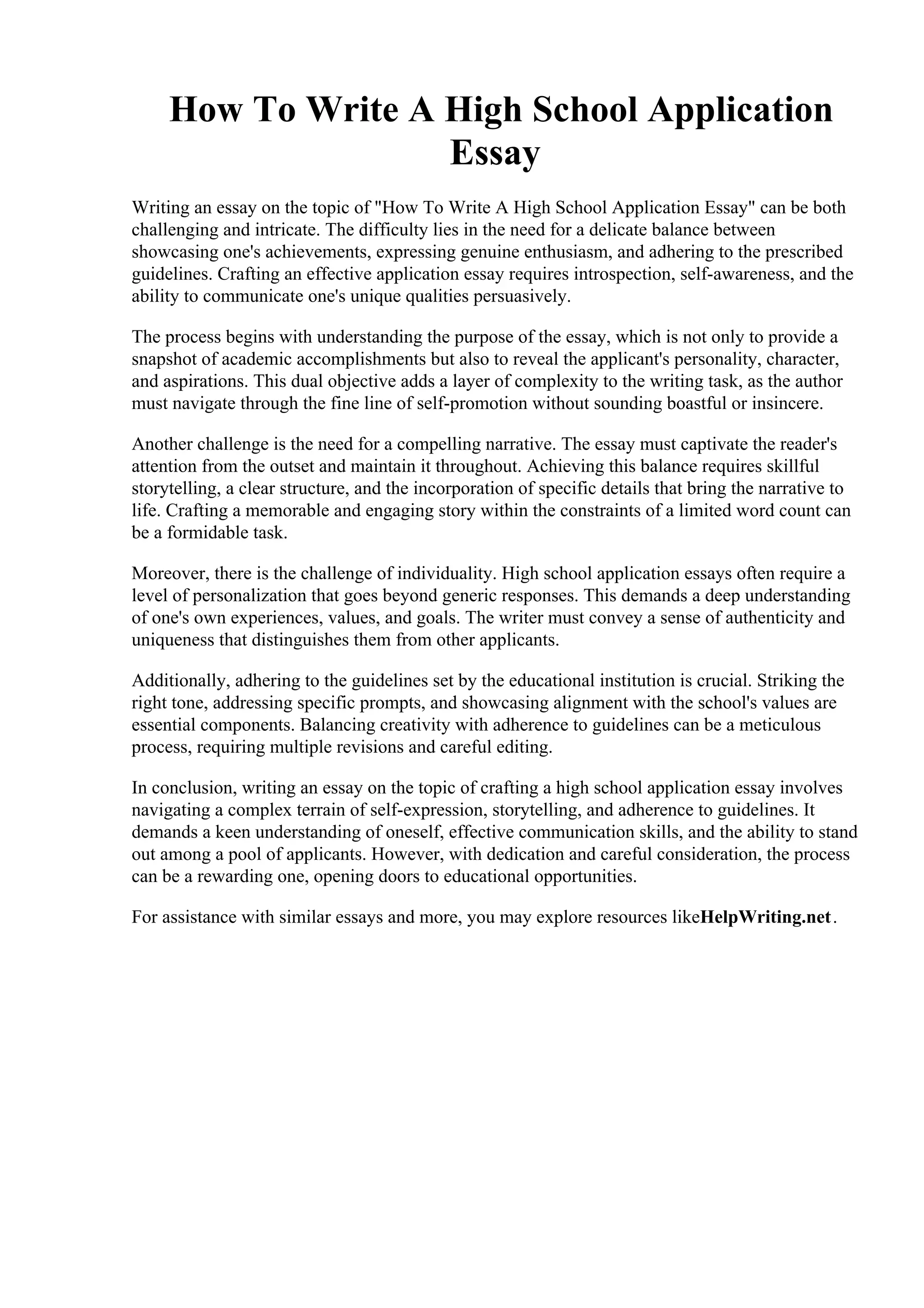The document provides guidance on writing a high school application essay, highlighting the need for self-awareness, effective storytelling, and adherence to institutional guidelines. It emphasizes the balance between showcasing achievements and maintaining authenticity while also analyzing the challenges of crafting a unique narrative within a limited word count. Additionally, it notes the importance of personal experiences and the requirement to align with the school's values to stand out among applicants.