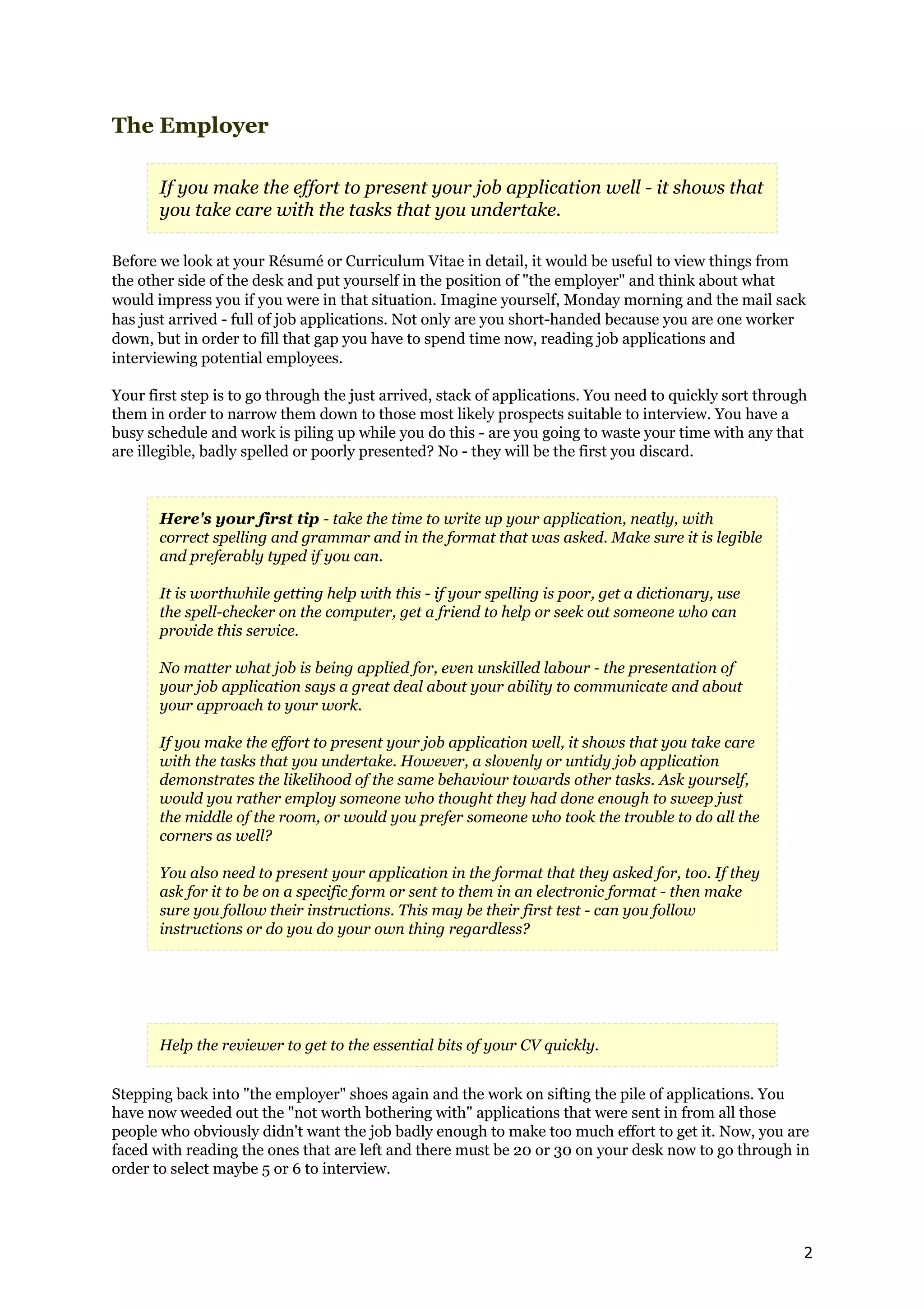 This document provides tips for writing an effective CV or resume. It discusses how the goal is to convince the employer that you are qualified for the job based only on your written application. The first paragraph must sell your skills and qualifications, as the employer will likely discard applications that do not do this well. Customizing each CV to the specific job is important, and neat presentation shows attention to detail. The first few sentences should highlight your most relevant qualifications and experience to grab the employer's attention. Honesty is also important, as getting caught in a lie will undermine your reputation.