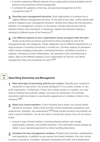 The document provides guidance on how to write an effective management plan. It recommends determining management structure, describing roles and responsibilities of management team members, and establishing policies and procedures for key business operations. The management plan should then be reviewed by consultants, approved by owners, and committed to ongoing revisions to ensure it remains effective over time.
