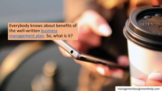 The document provides guidance on writing a comprehensive management plan, emphasizing its importance for business success. Key components include detailing management structure, responsibilities, decision-making processes, and board member qualifications. It encourages revision and suggests seeking professional help if needed.