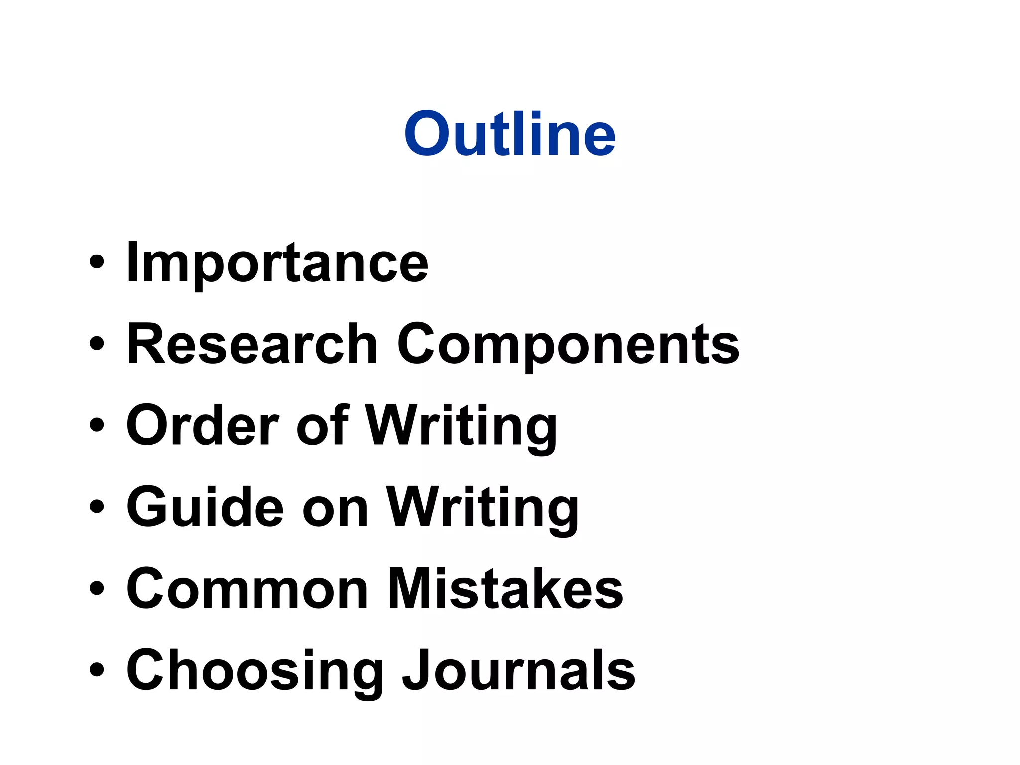 This document provides guidance on how to write a research paper. It discusses important steps like developing an outline, order of writing sections, common mistakes to avoid, and choosing appropriate journals for publication. Key sections include writing the introduction, methods, results and discussion sections in detail. Tips provided include starting with the results section, ensuring reproducibility in methods, and explaining the meaning and implications of results. The document emphasizes writing drafts, getting feedback, and revising multiple times before submission to improve quality.