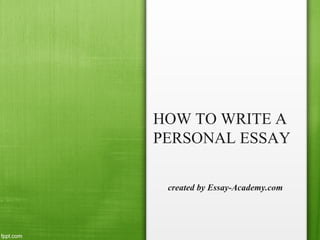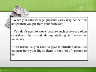 This document provides guidance on how to write a successful personal essay. It emphasizes using active voice and specific, descriptive language to engage the reader. The personal essay is meant to showcase your unique writing style and voice. Key elements to focus on include using active rather than passive voice, providing descriptive details to illustrate events, and writing genuinely from your own feelings and perspective without weak language. Staying true to your own opinion is important to clearly convey your position to the reader.