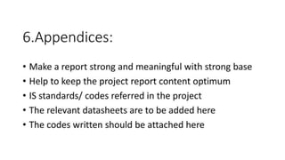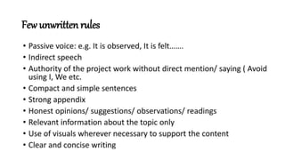 The document outlines the standard structure and organization of a project report, including essential components such as the title page, declaration, acknowledgements, abstract, table of contents, and various lists. It emphasizes the importance of systematically presenting the introduction, body, experimental results, conclusion, future scope, references, and appendices. Additionally, it highlights the need for a focused problem statement and a literature survey.
